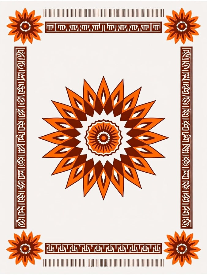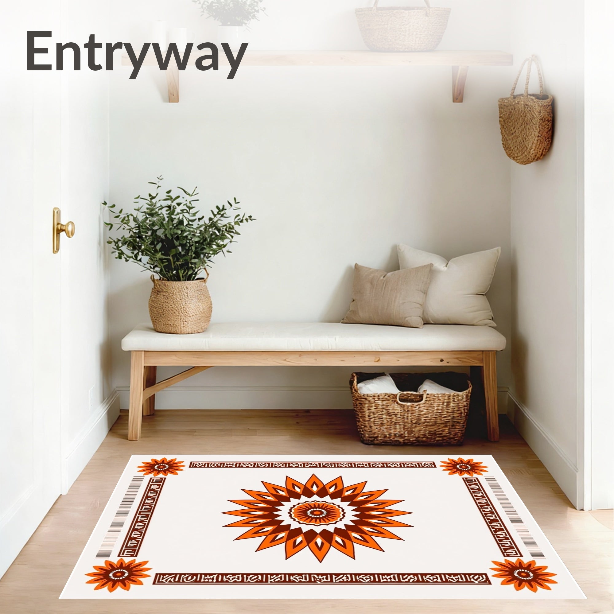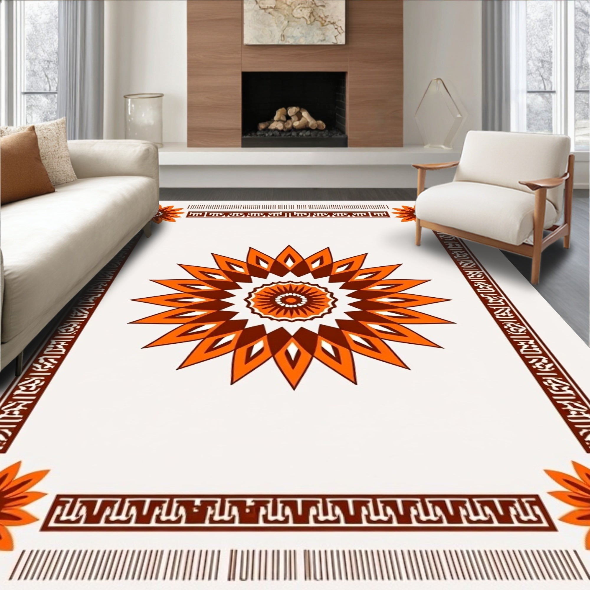 Ultra Soft Area Rug, Non Slip, Stain Resistant, Washable Area Rugs for Living Room, Bedroom, Sunburst Medallion with Aztec Border(Orange) Overview:
