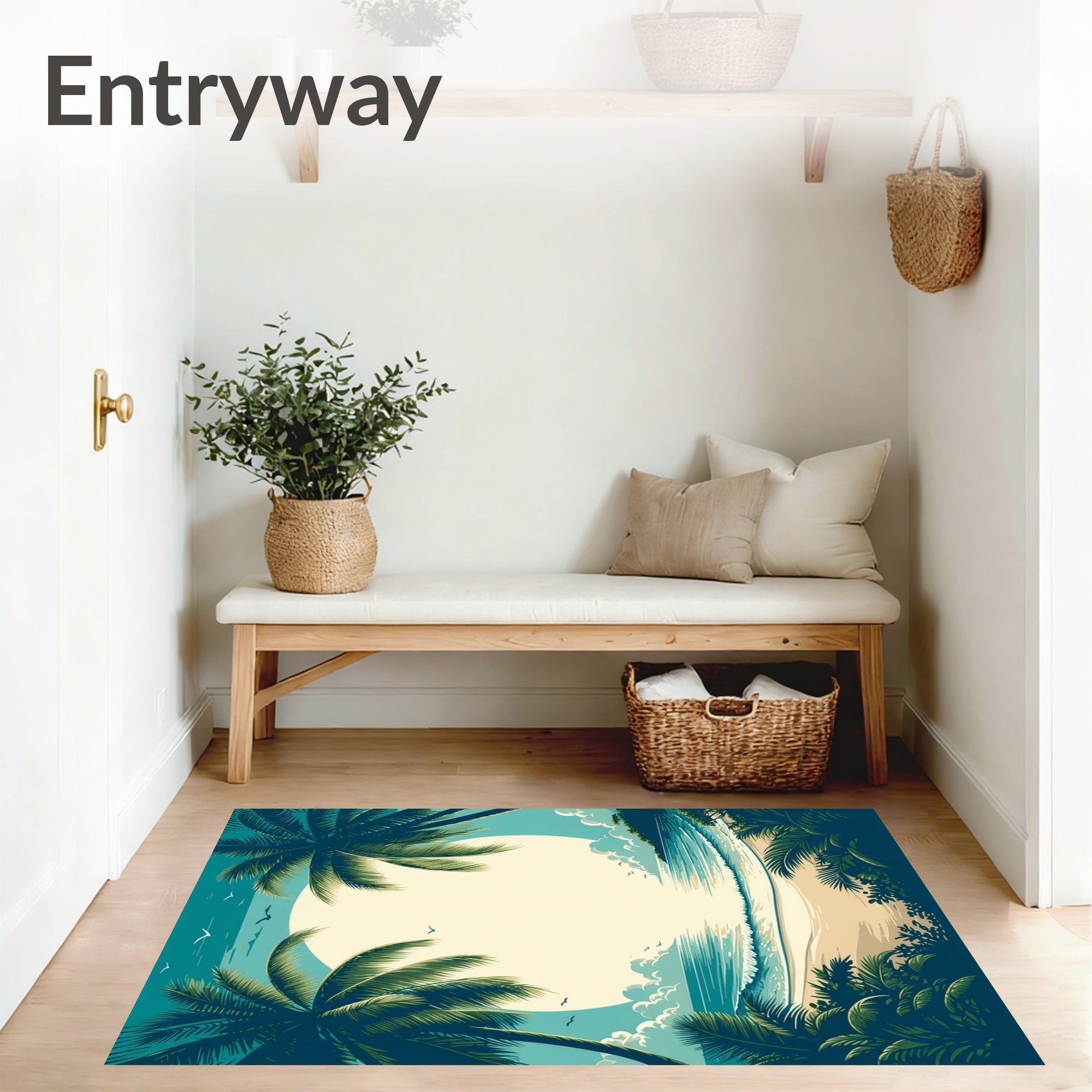 Flatwoven High Traffic Area Rug, Teal Beige Tropical Coconut Tree Beach Scenery Indoor, Non Slip, Stain Resistant, Washable Area Rugs for Living Room, Bedroom (Blue) Overview: