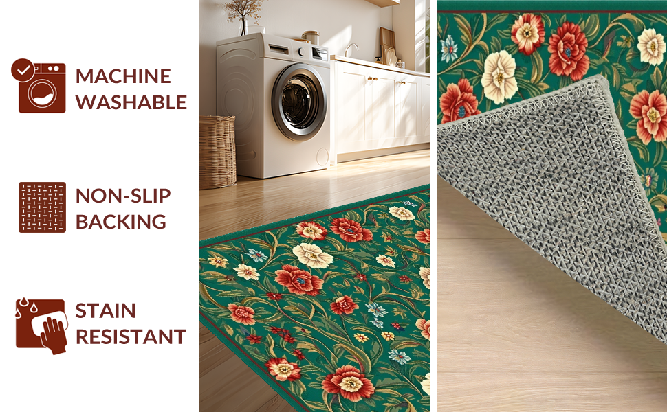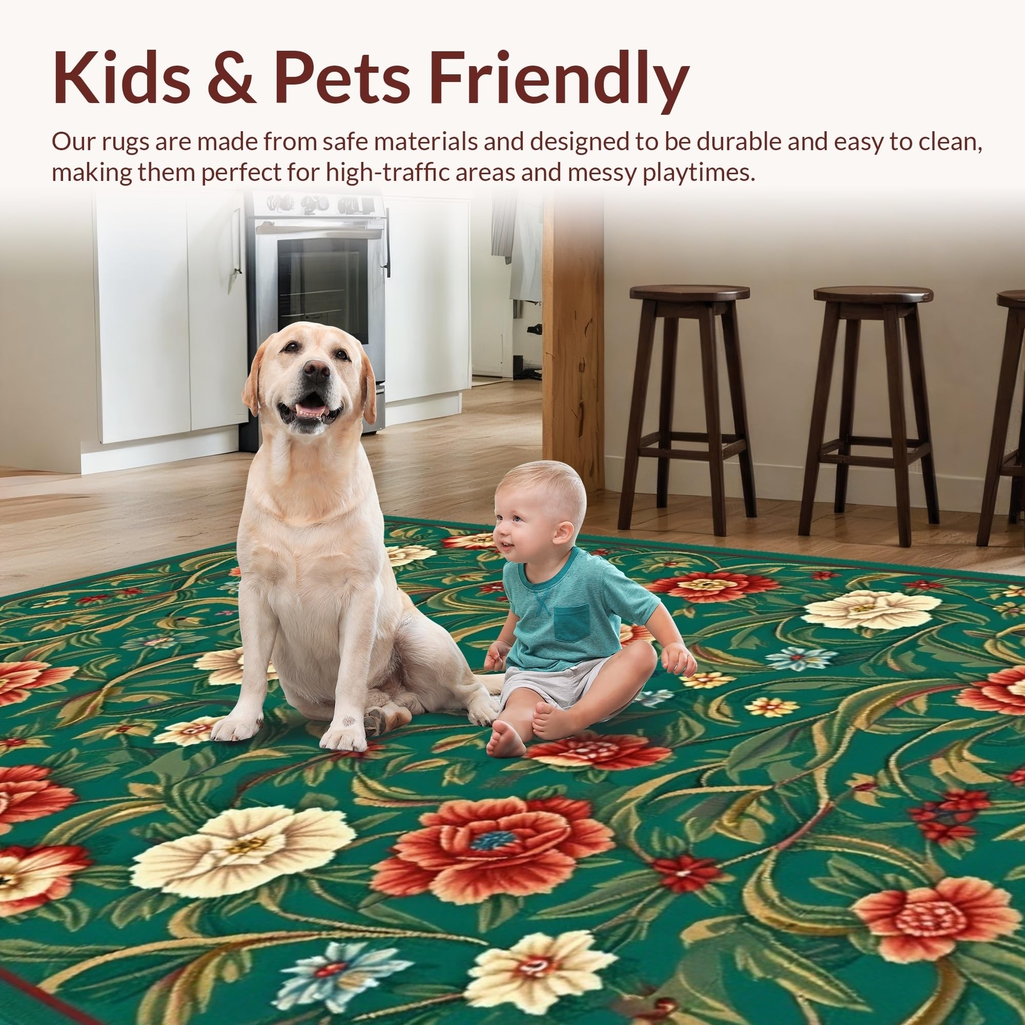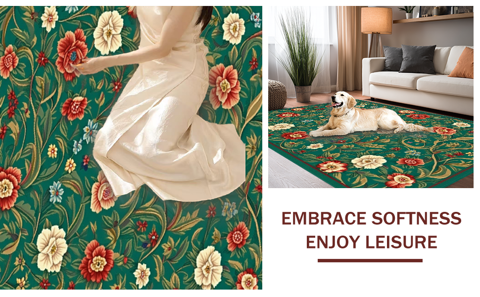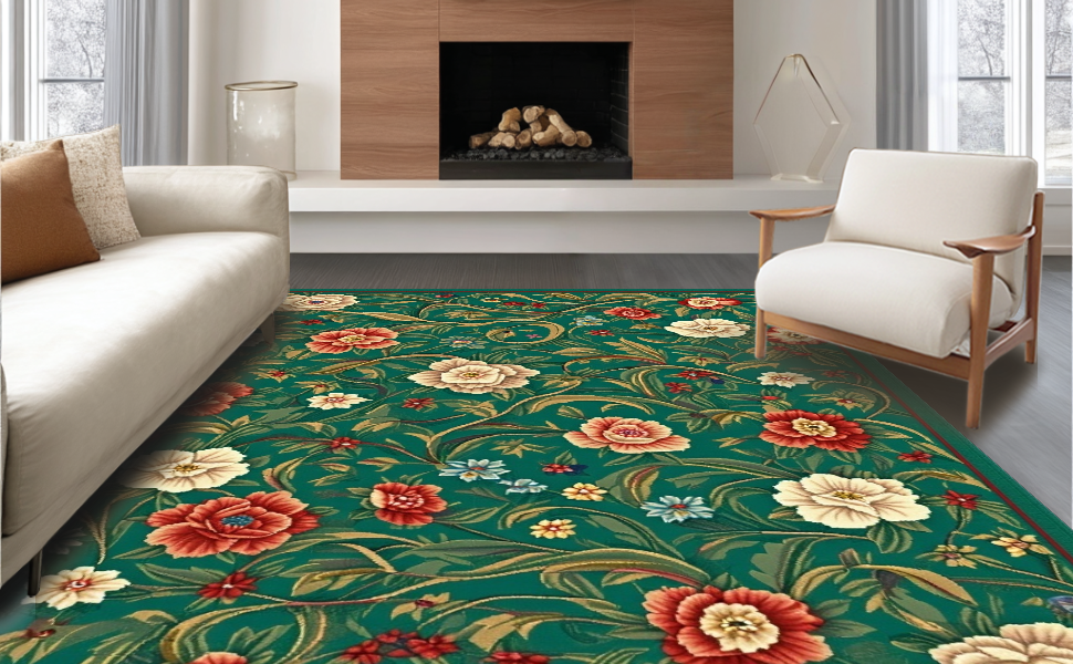 Ultra Soft Area Rug, Non Slip, Stain Resistant, Washable Area Rugs for Living Room, Bedroom, Timeless Classic Floral Symmetry(Green) Overview:
