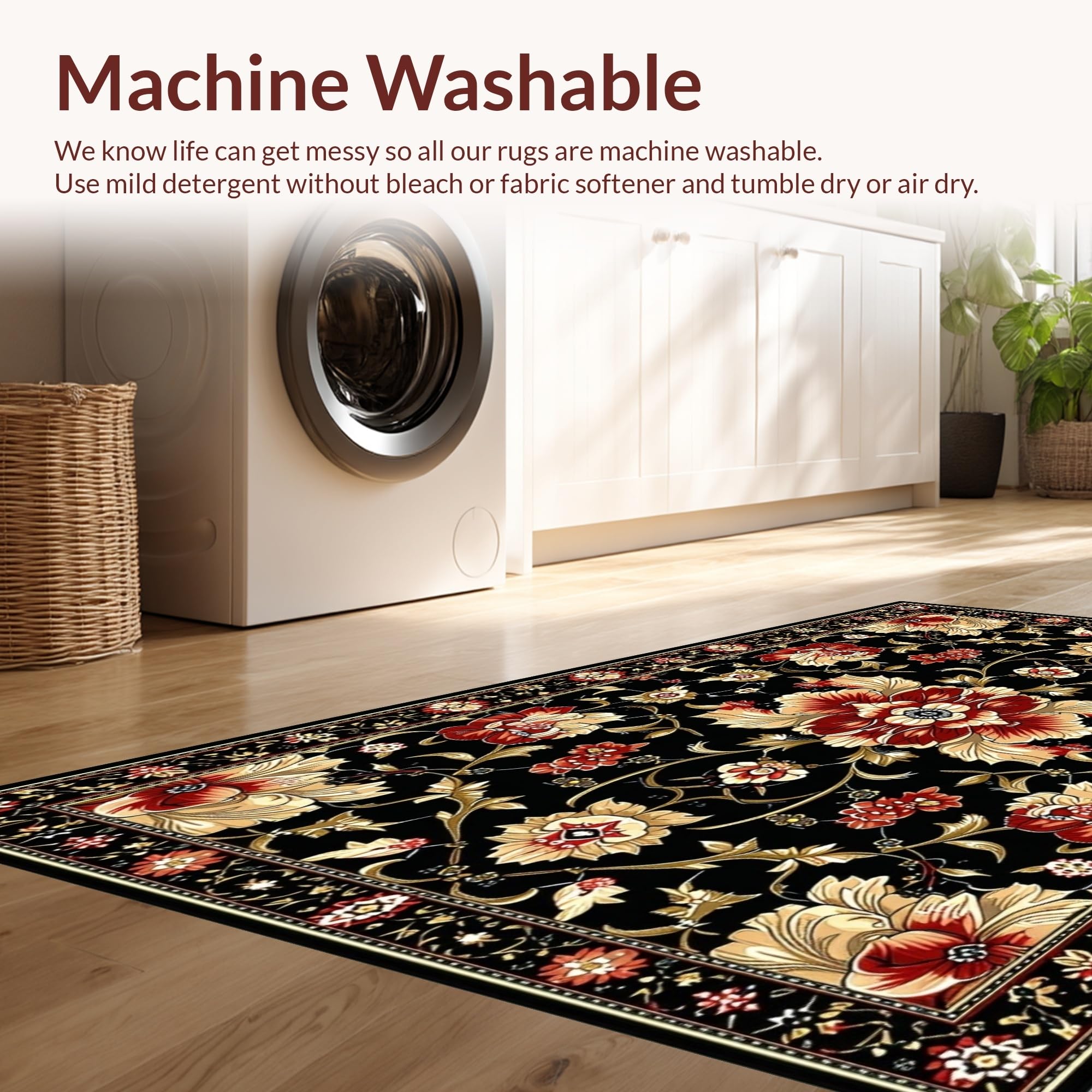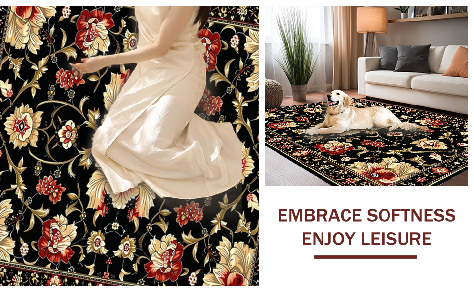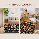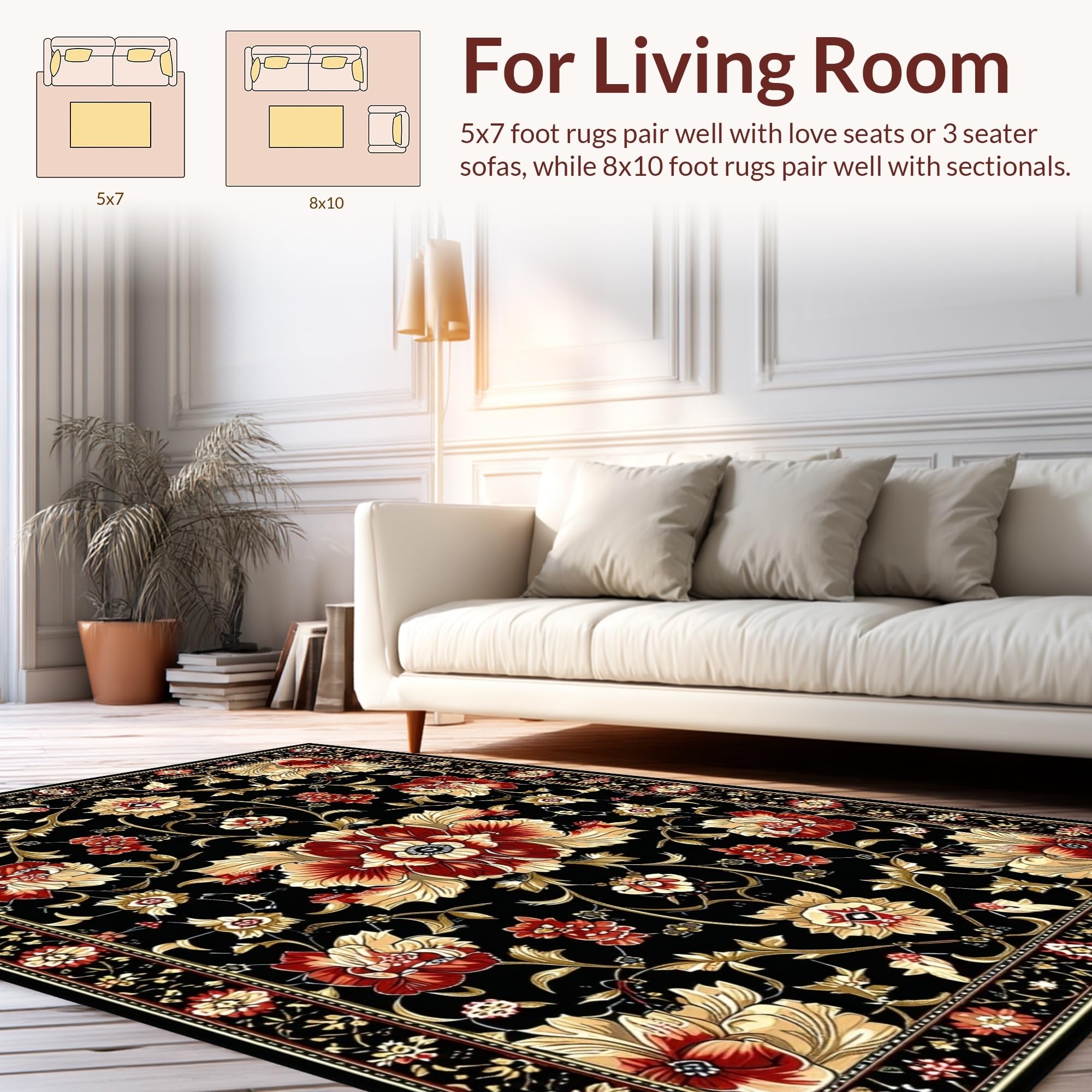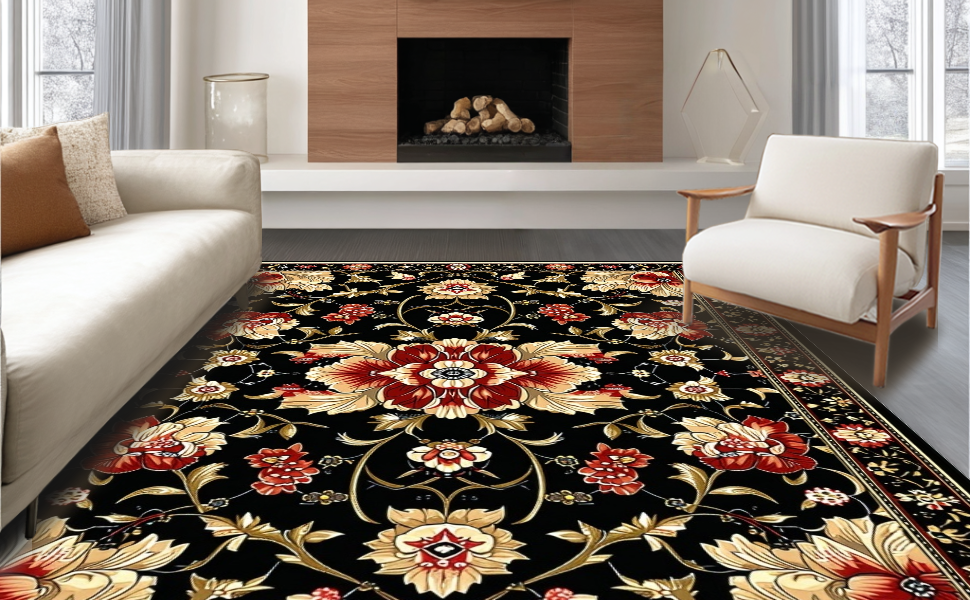 Ultra Soft Area Rug, Non Slip, Stain Resistant, Washable Area Rugs for Living Room, Bedroom, Traditional Handcrafted Flower Motif(Black) Overview: