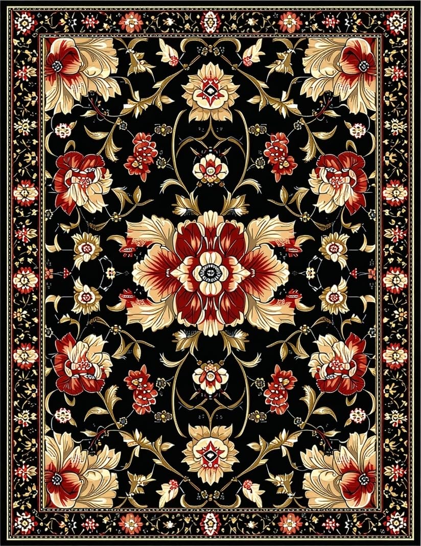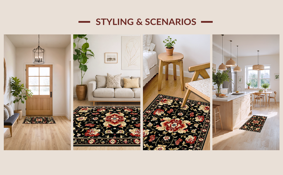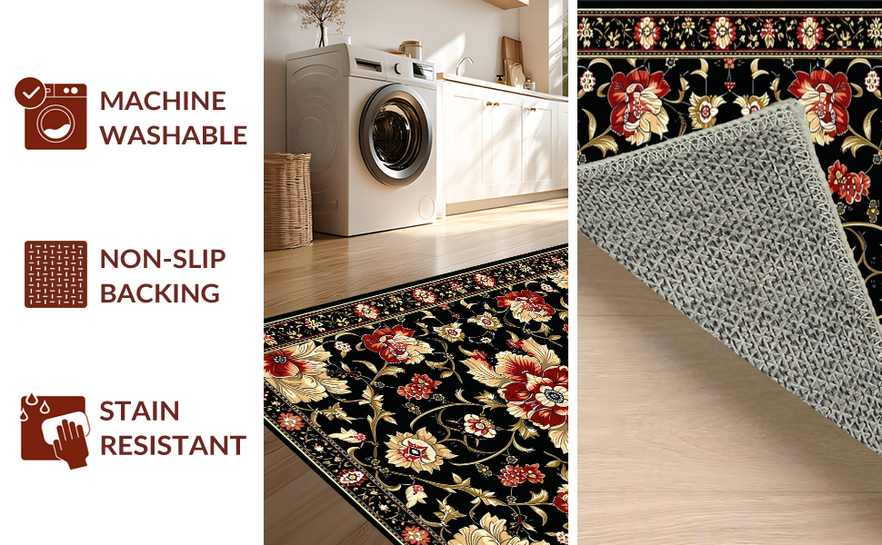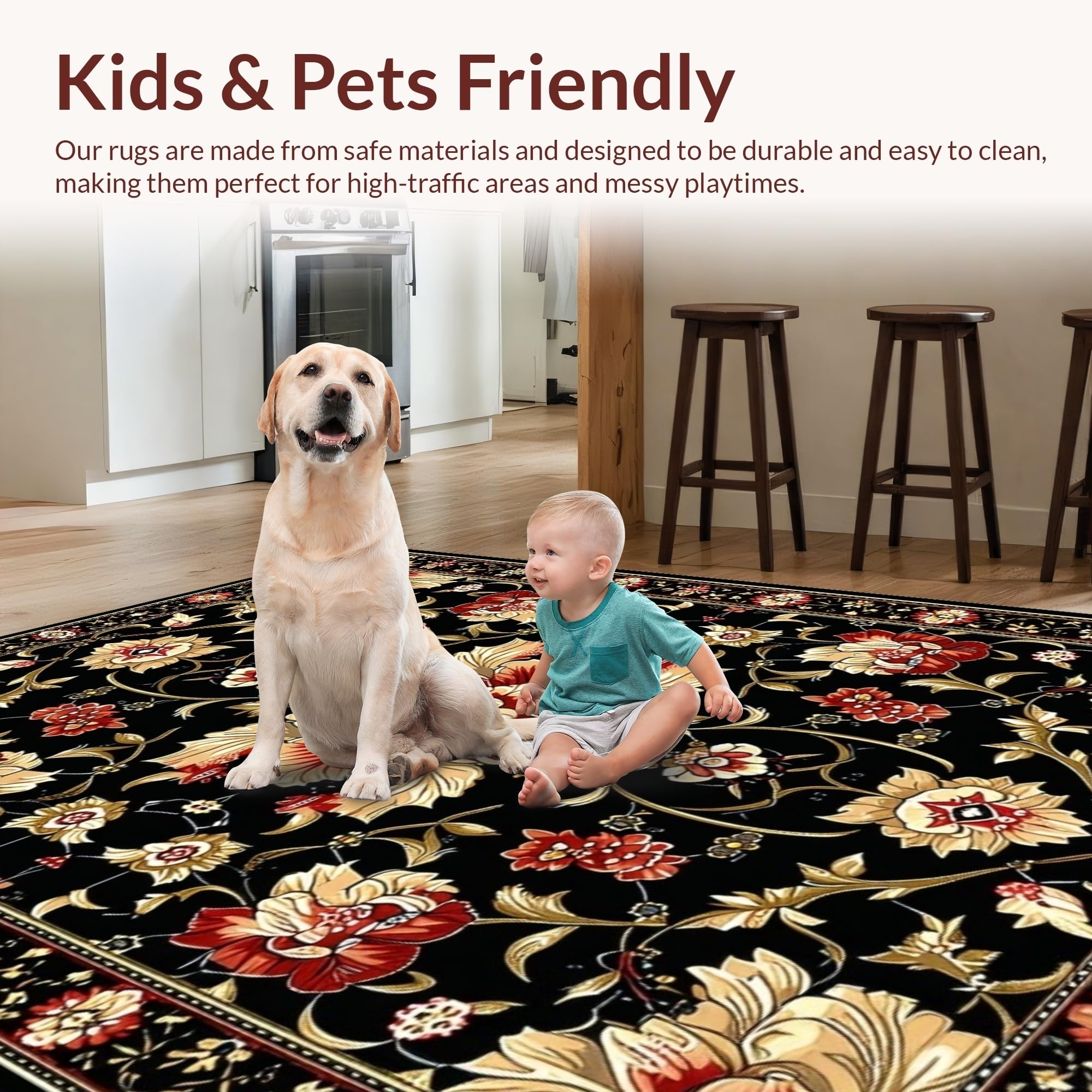 Ultra Soft Area Rug, Non Slip, Stain Resistant, Washable Area Rugs for Living Room, Bedroom, Traditional Handcrafted Flower Motif(Black) Overview: