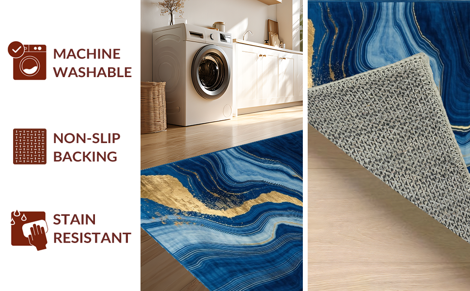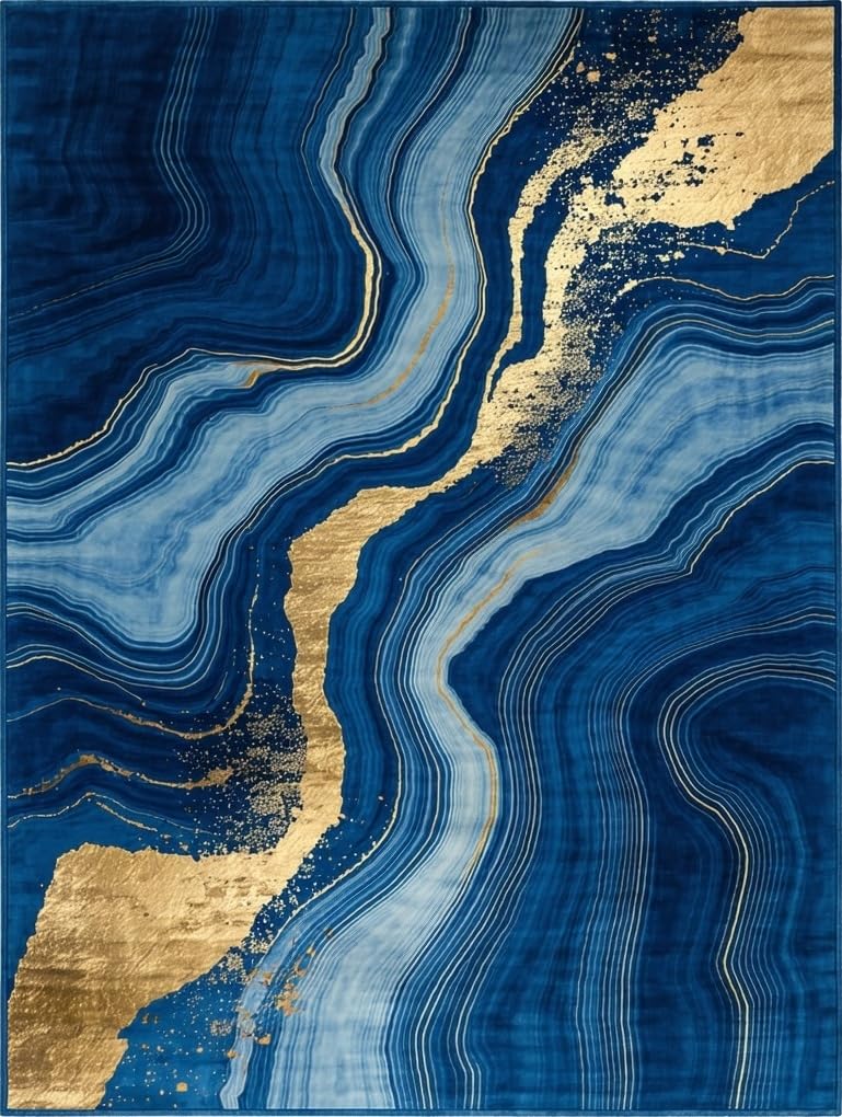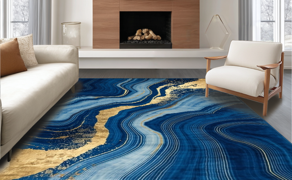 Ultra Soft Area Rug, Non Slip, Stain Resistant, Washable Area Rugs for Living Room, Bedroom, Trendy Marbleized Blue Tones(Blue) Overview: