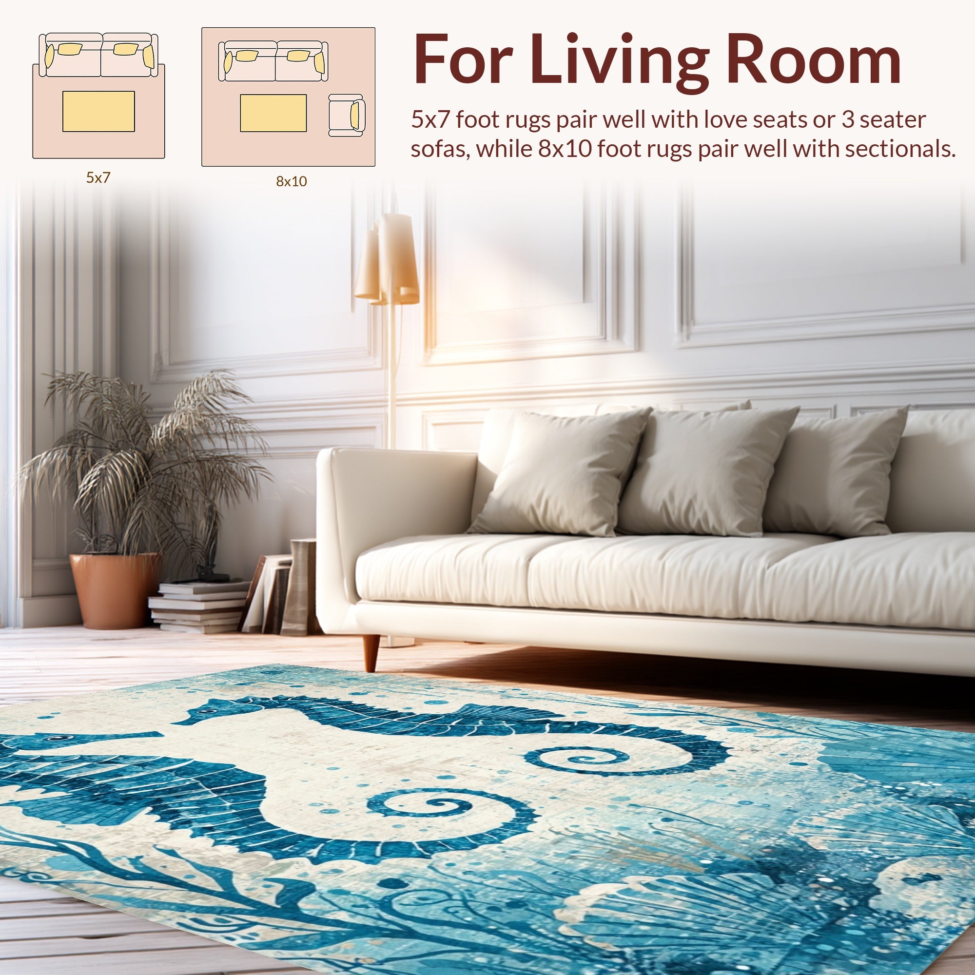 Flatwoven High Traffic Area Rug, Trendy Ocean Themed with Decorative Seahorse and Shell, Non Slip, Stain Resistant, Washable Area Rugs for Living Room, Bedroom (Blue) Overview: