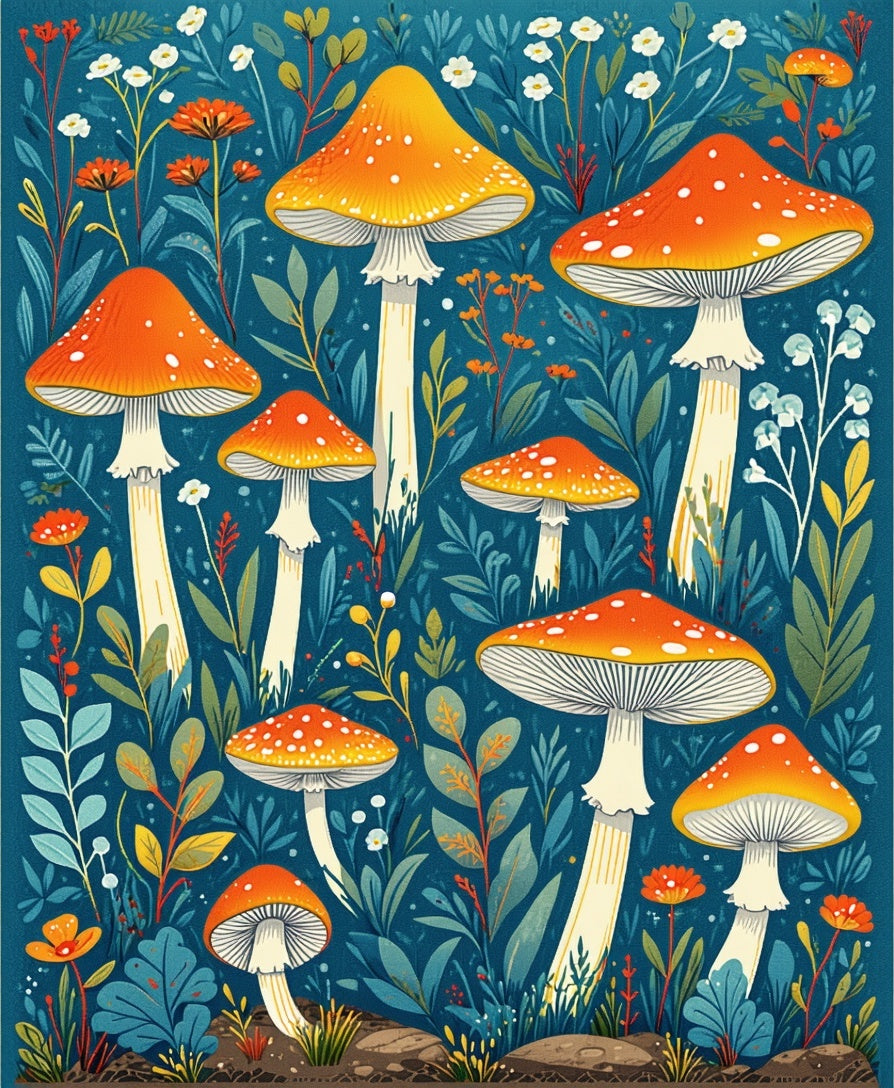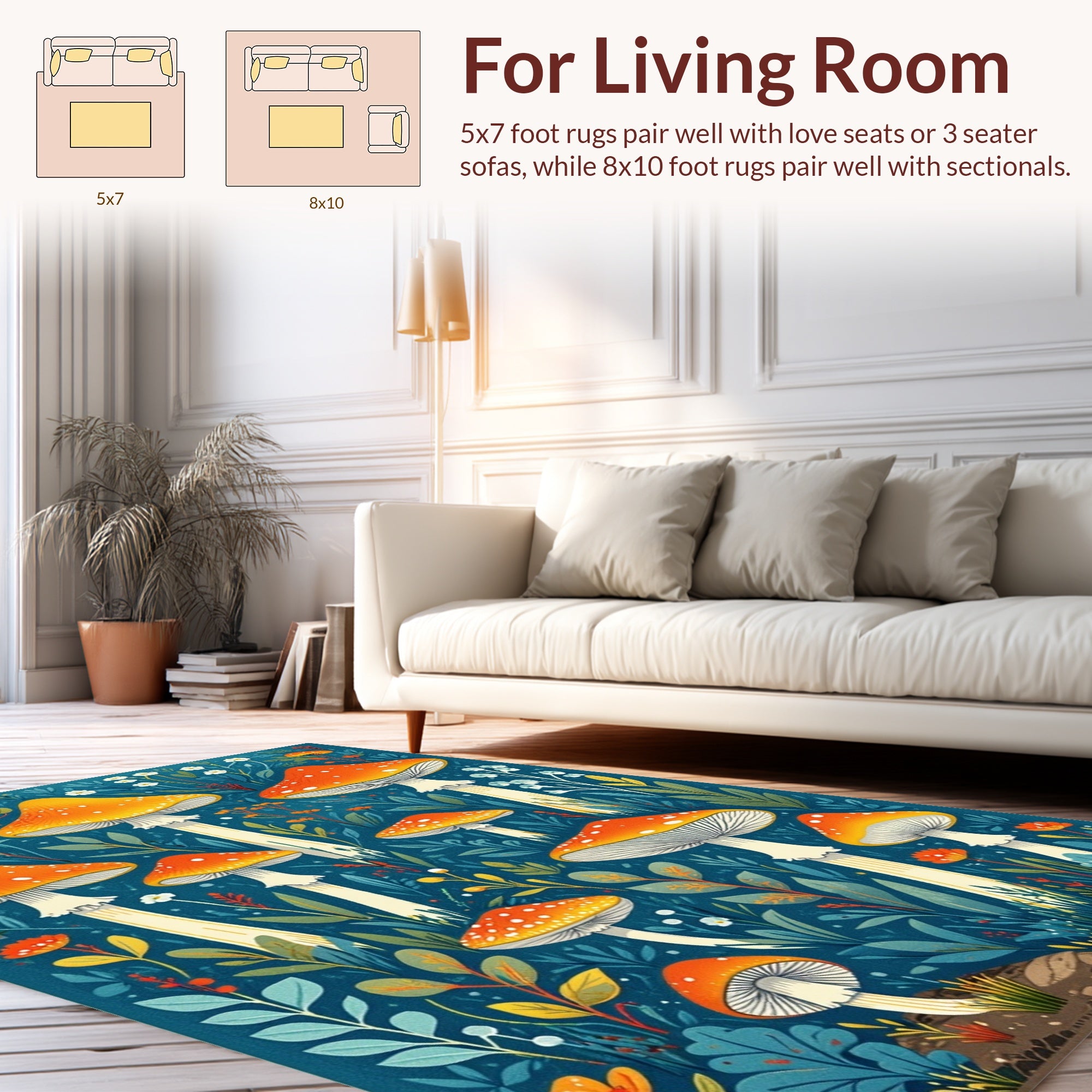 Flatwoven High Traffic Area Rug, Trendy Retro Mushroom Illustration, Non Slip, Stain Resistant, Washable Area Rugs for Living Room, Bedroom (Blue) Overview: