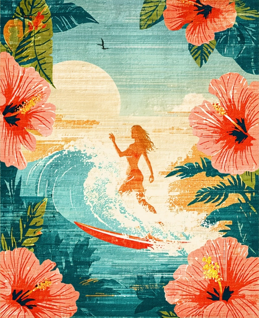 Tropical Hibiscus Surfboard Artwork with Retro Design(Red)