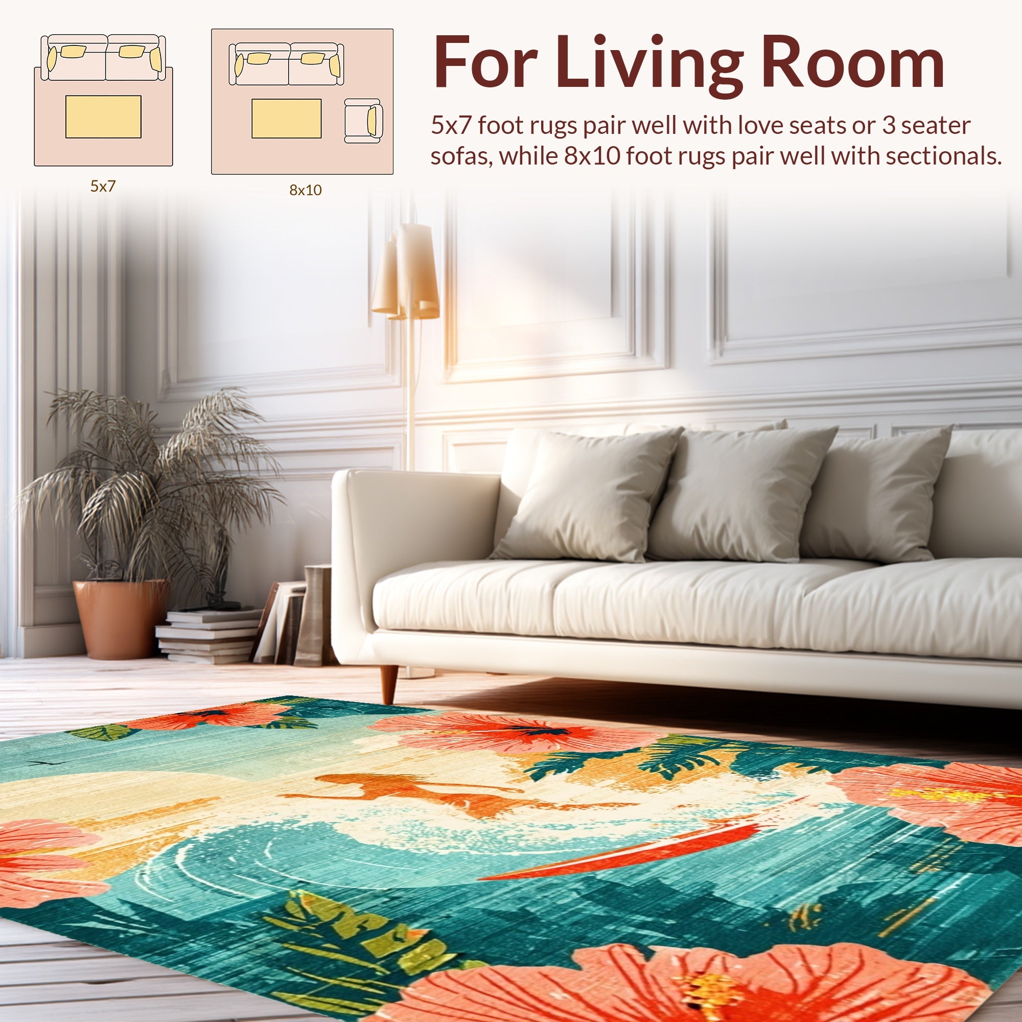 Flatwoven High Traffic Area Rug, Tropical Hibiscus Surfboard Artwork with Retro Design, Non Slip, Stain Resistant, Washable Area Rugs for Living Room, Bedroom (Red) Overview: