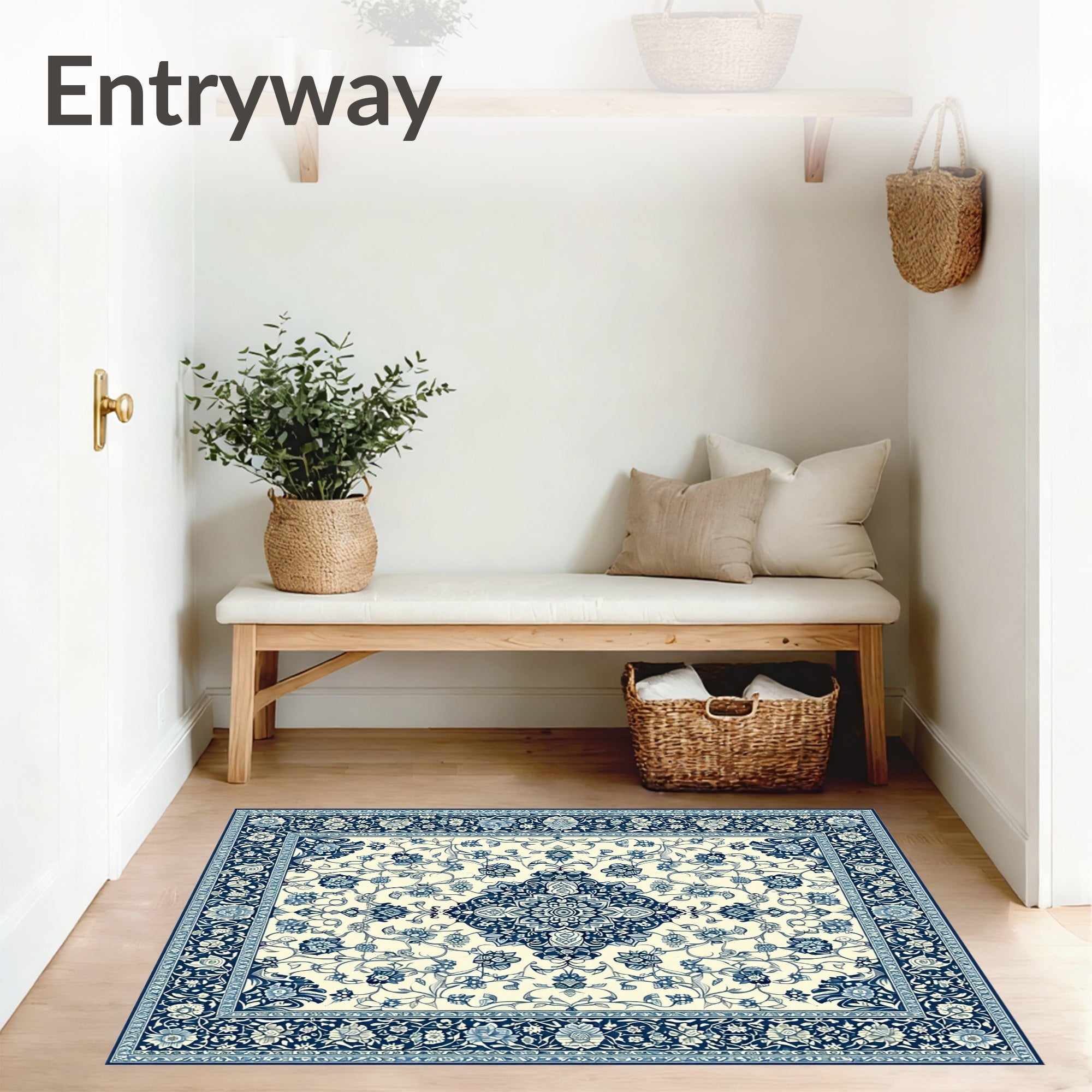 Flatwoven High Traffic Area Rug, Urbane Oasis Collection Medallion Bloom Design, Non Slip, Stain Resistant, Washable Area Rugs for Living Room, Bedroom (Ivory) Overview: