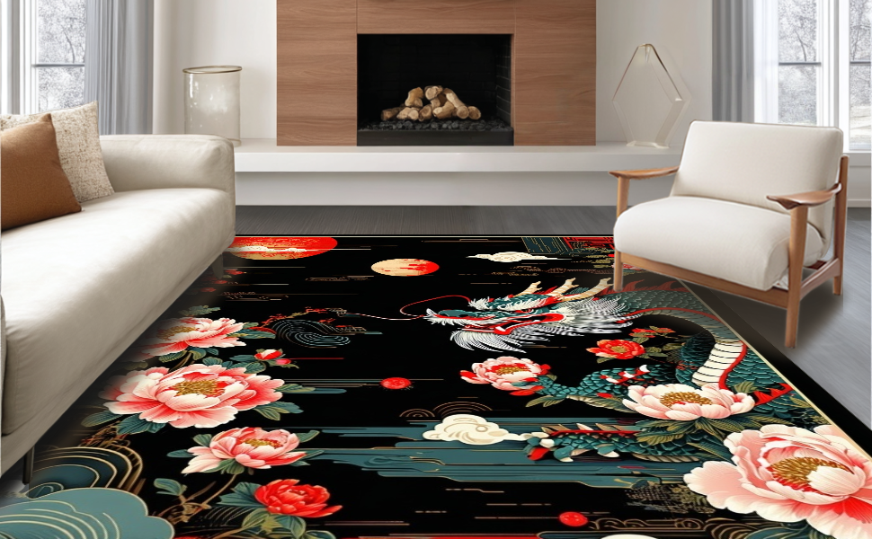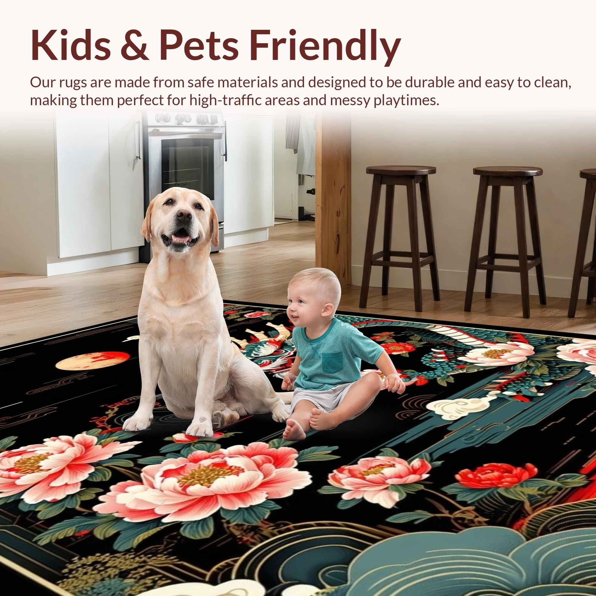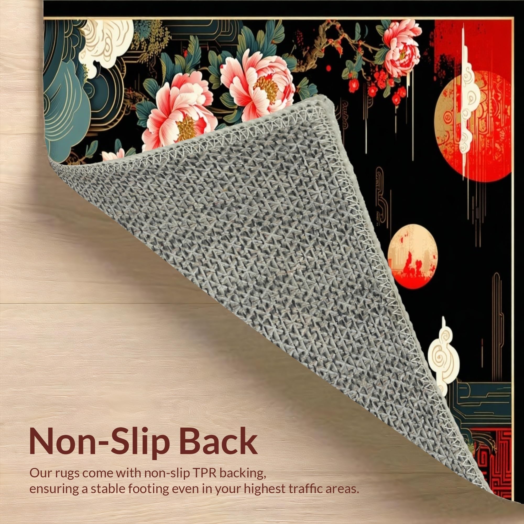Ultra Soft Area Rug, Non Slip, Stain Resistant, Washable Area Rugs for Living Room, Bedroom, Vibrant Asian Inspired Motif(Black) Overview: