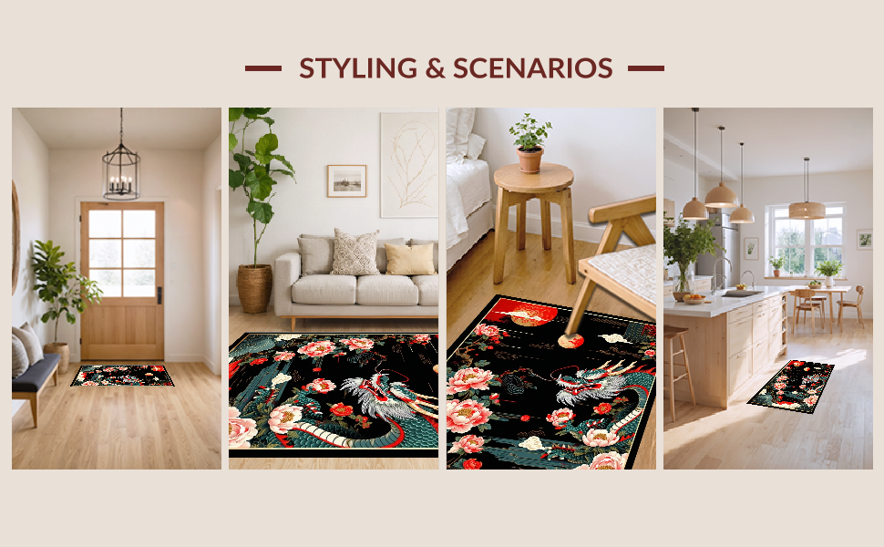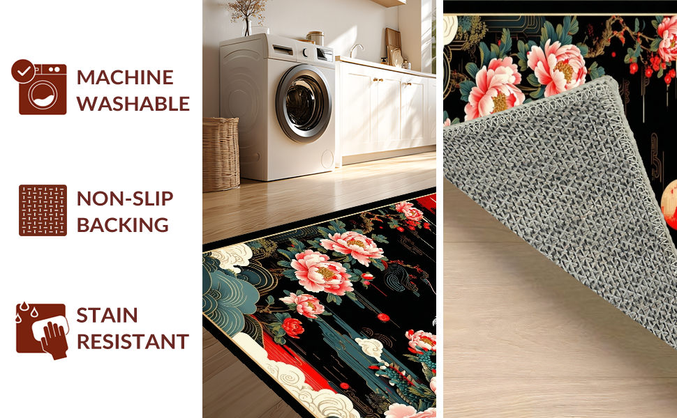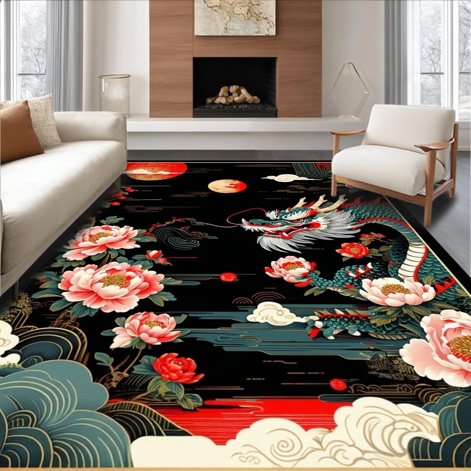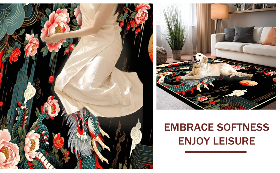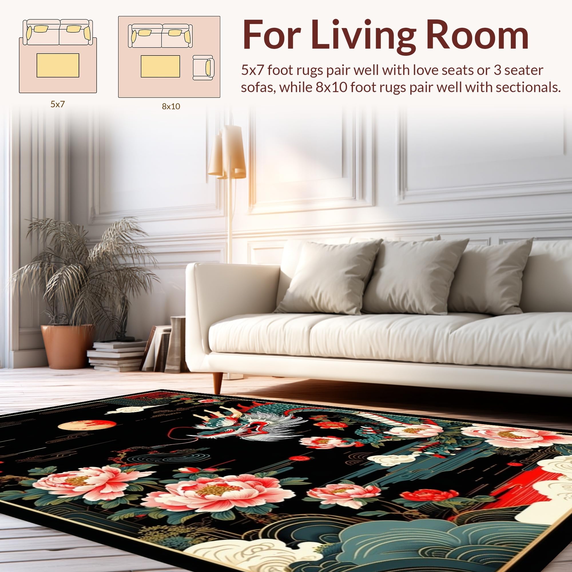 Ultra Soft Area Rug, Non Slip, Stain Resistant, Washable Area Rugs for Living Room, Bedroom, Vibrant Asian Inspired Motif(Black) Overview: