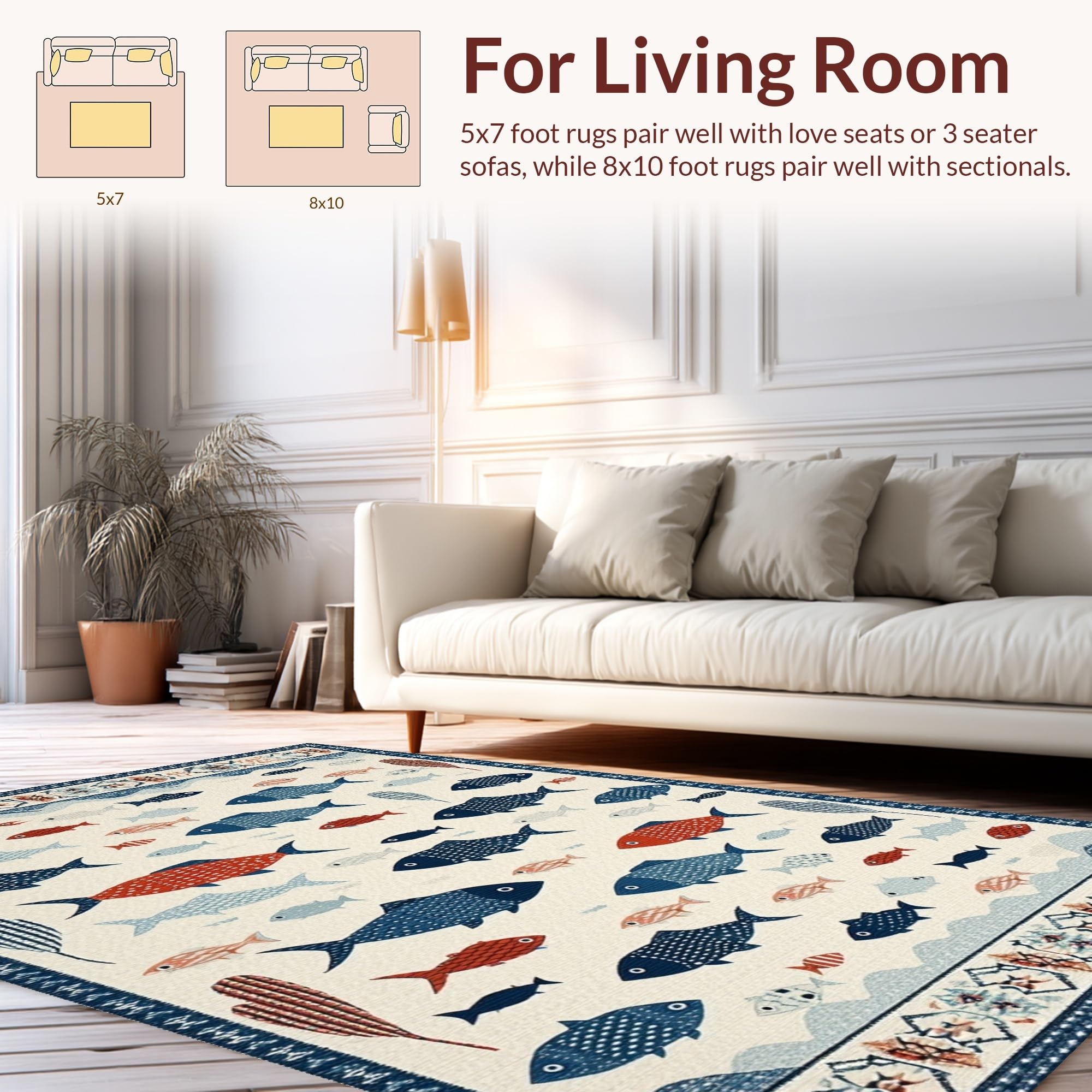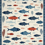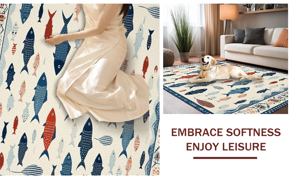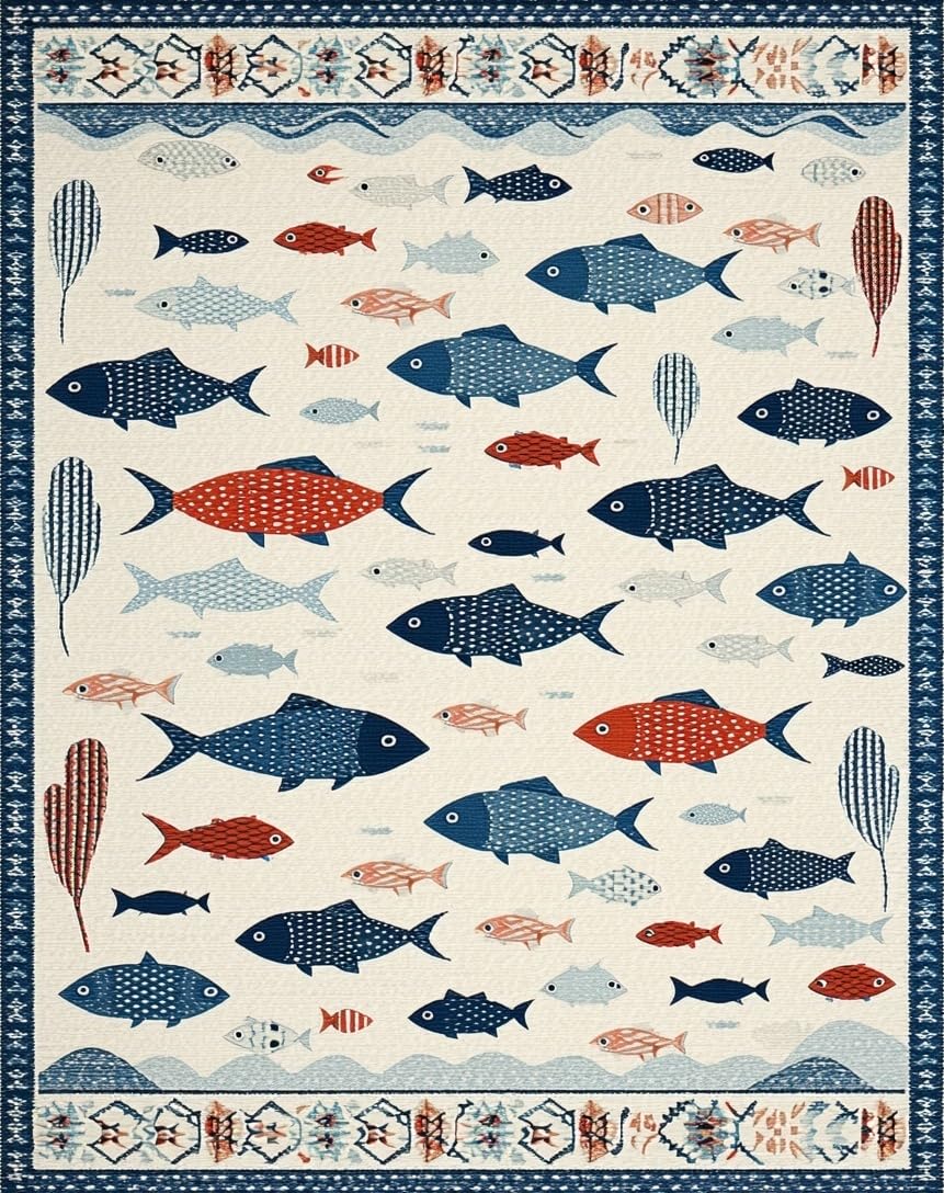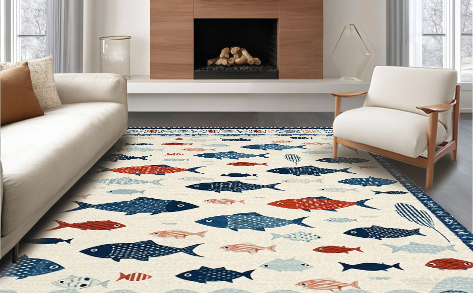 Ultra Soft Area Rug, Non Slip, Stain Resistant, Washable Area Rugs for Living Room, Bedroom, Vibrant Fish Motif Contemporary Flair(White) Overview: