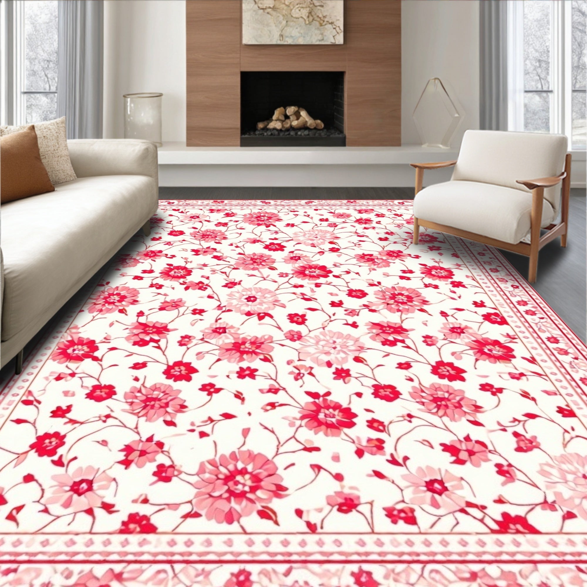 Flatwoven High Traffic Area Rug, Vibrant Retro Blossom Design, Non Slip, Stain Resistant, Washable Area Rugs for Living Room, Bedroom (White) Overview: