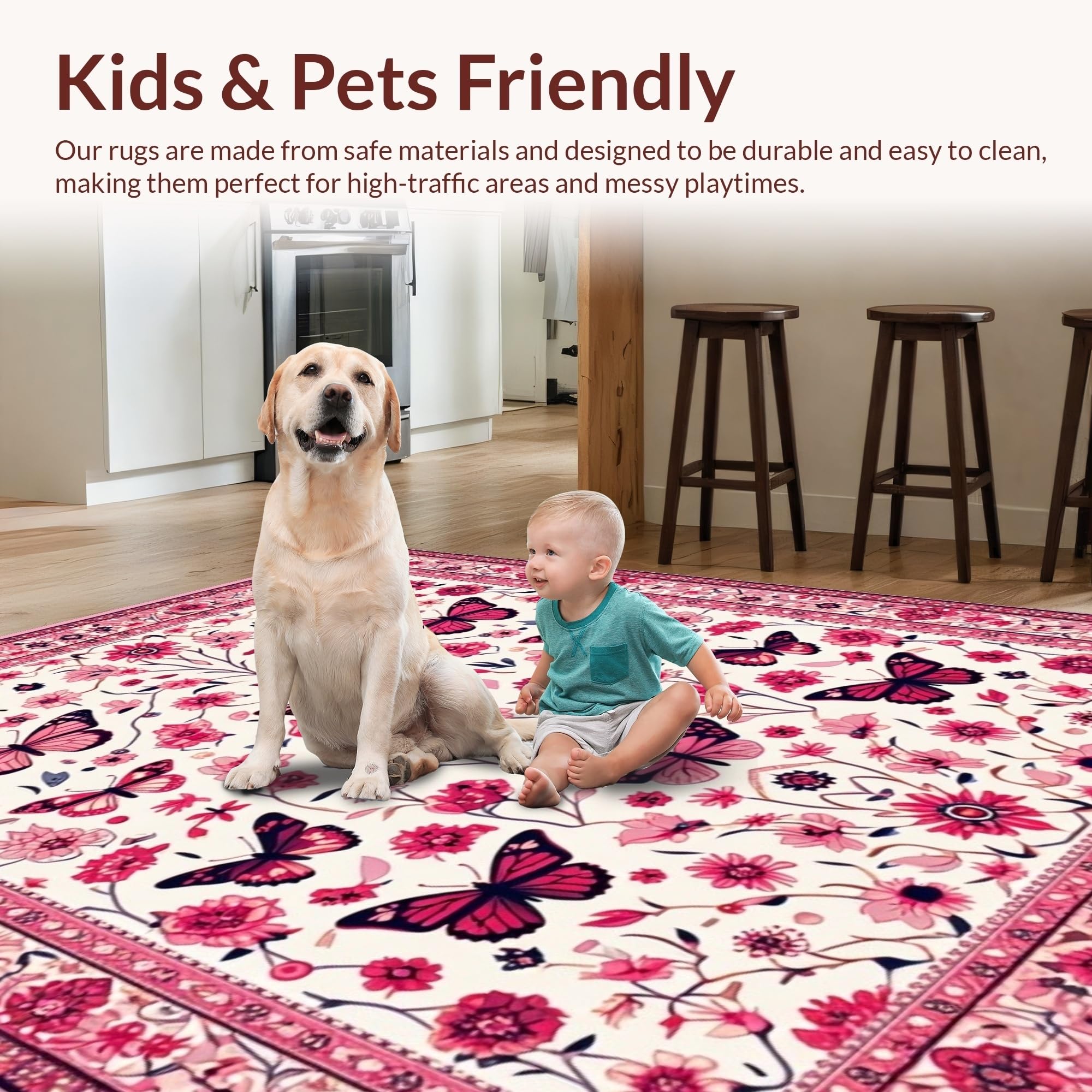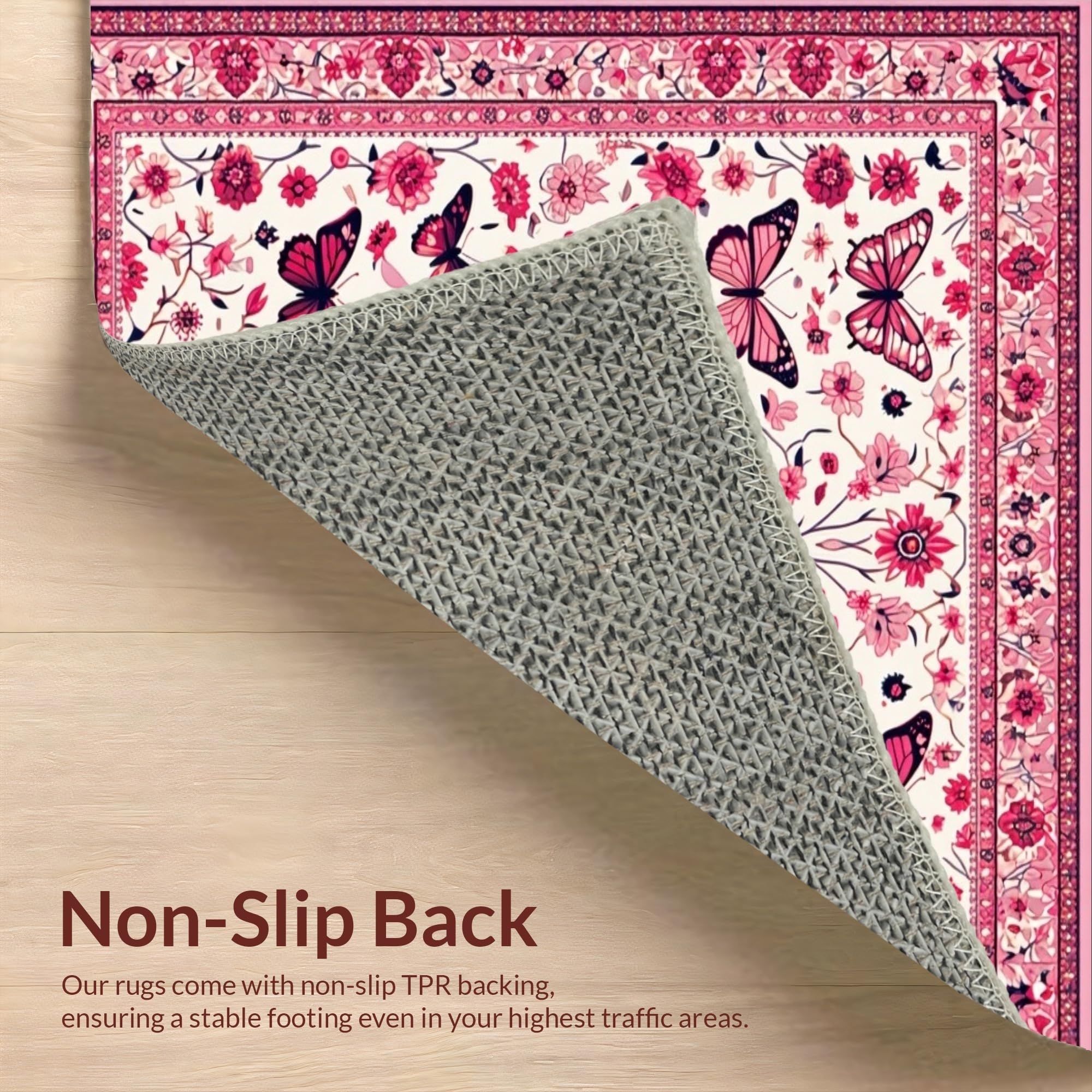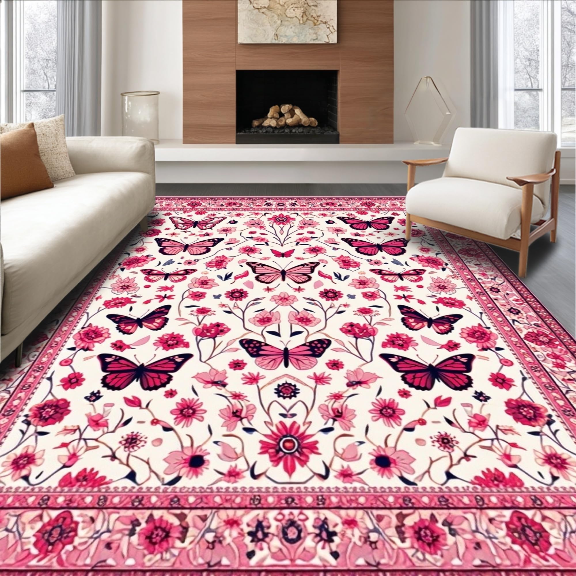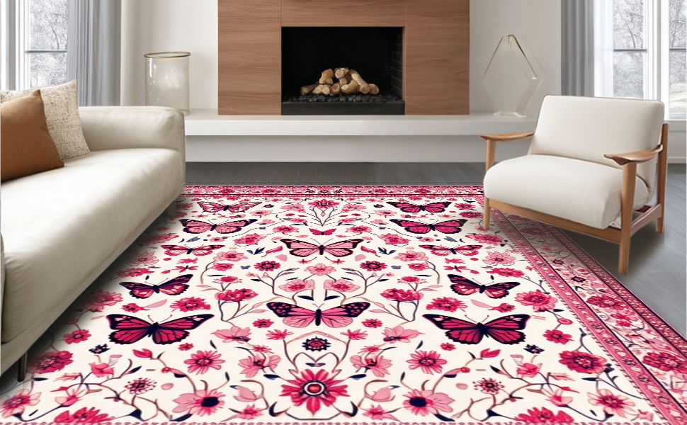 Ultra Soft Area Rug, Non Slip, Stain Resistant, Washable Area Rugs for Living Room, Bedroom, Vibrant Tropical Butterfly Pattern(Pink) Overview: