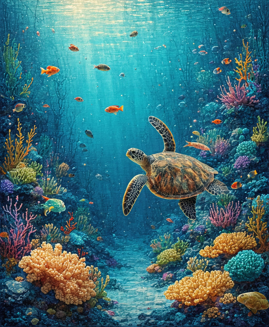 Vibrant Underwater With Sea Turtles Swimming Among Coral Reef(Blue)