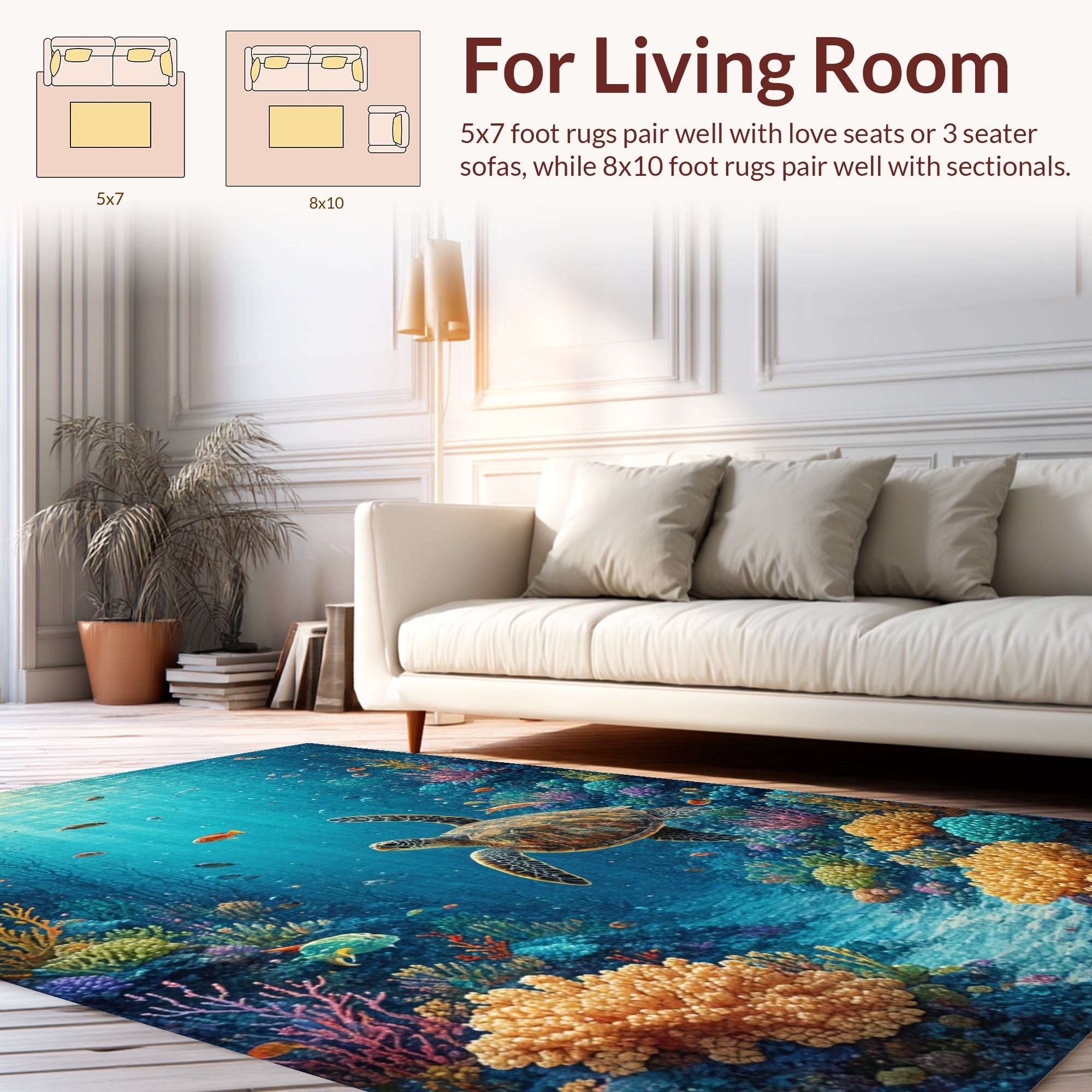 Flatwoven High Traffic Area Rug, Vibrant Underwater With Sea Turtles Swimming Among Coral Reef, Non Slip, Stain Resistant, Washable Area Rugs for Living Room, Bedroom (Blue) Overview: