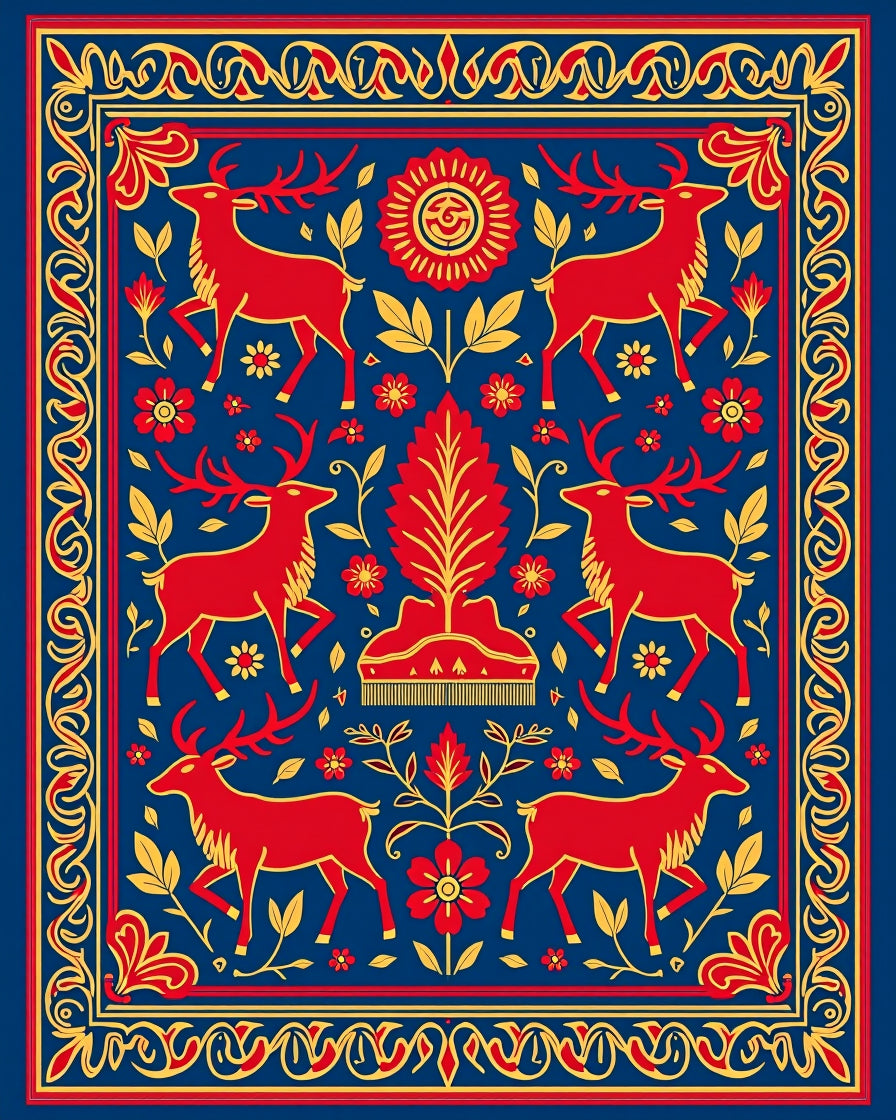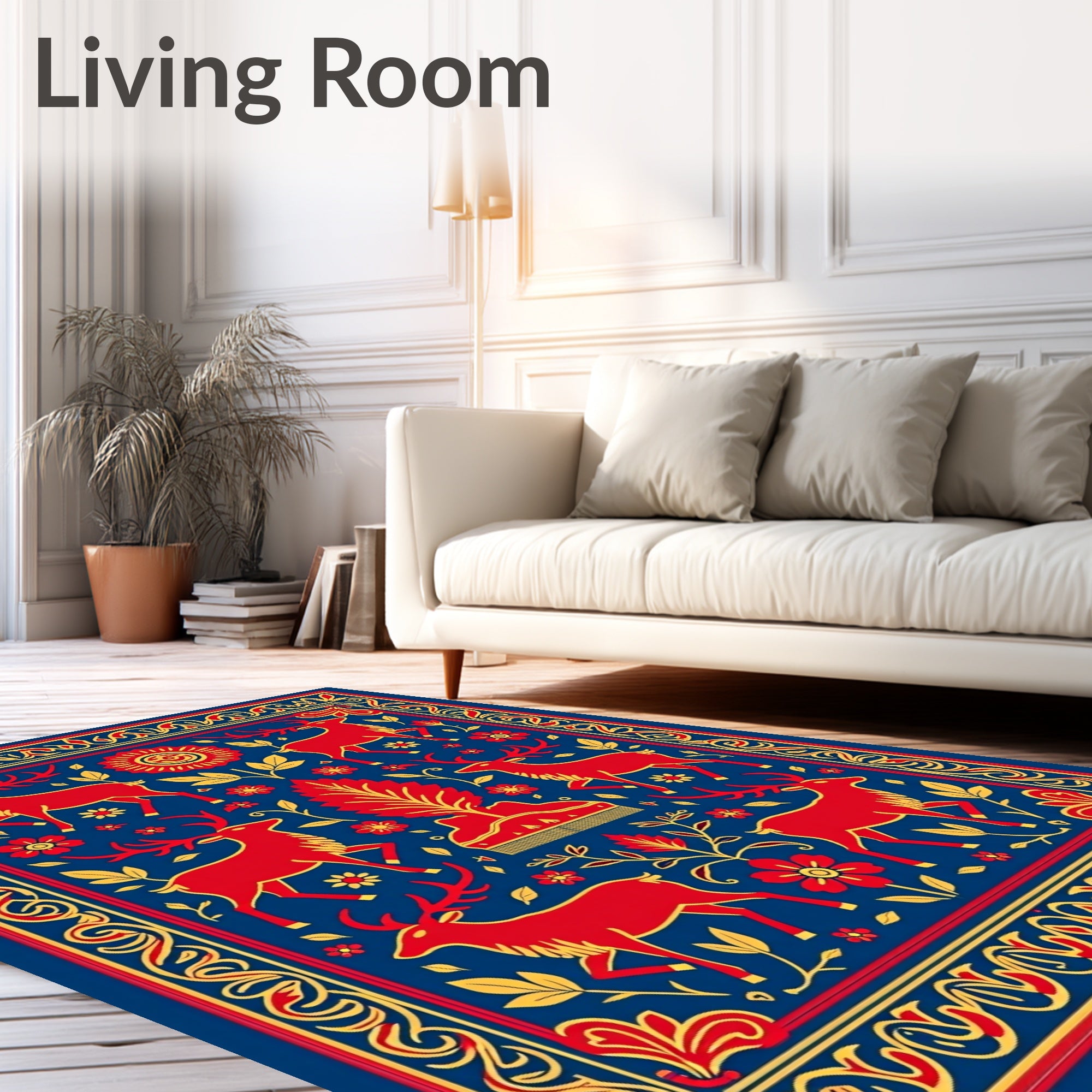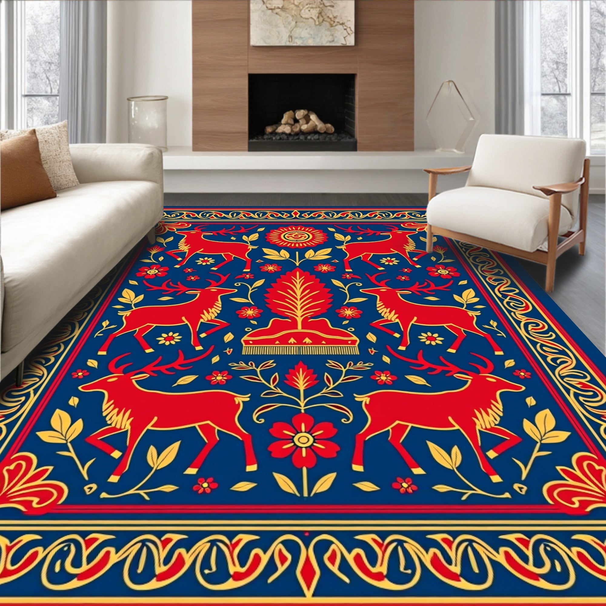 Ultra Soft Area Rug, Non Slip, Stain Resistant, Washable Area Rugs for Living Room, Bedroom, Vintage Elk with Intricate Folk Art Motifs(Blue) Overview: