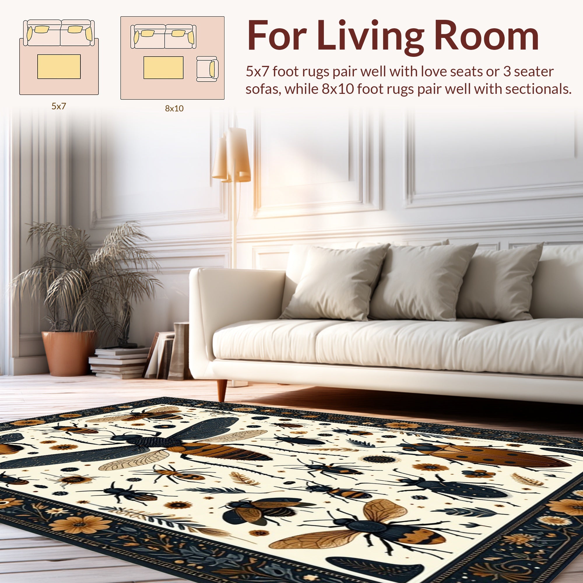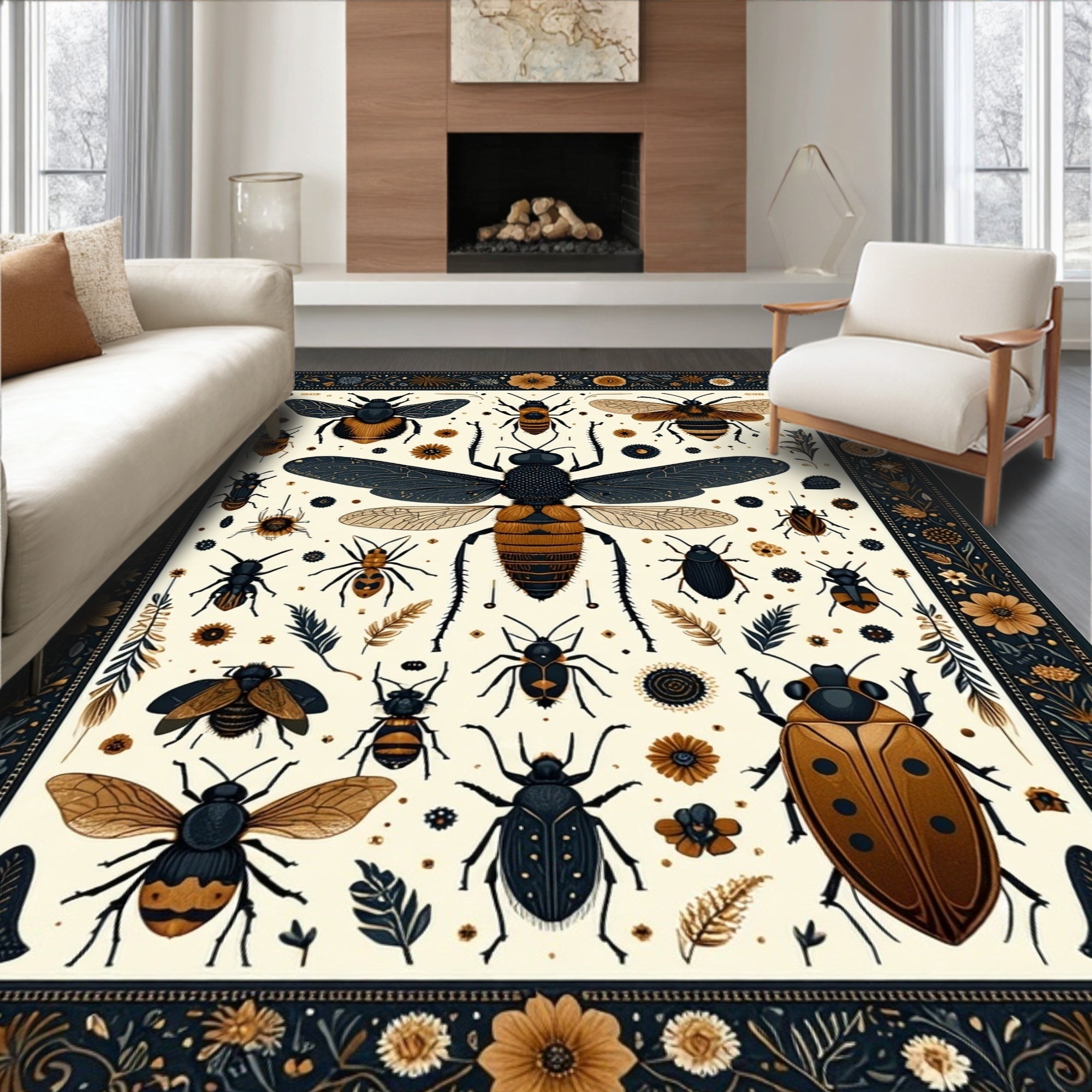 Flatwoven High Traffic Area Rug, Vintage Entomology Sketches with Boho Medallion Motifs, Non Slip, Stain Resistant, Washable Area Rugs for Living Room, Bedroom (Gold) Overview:
