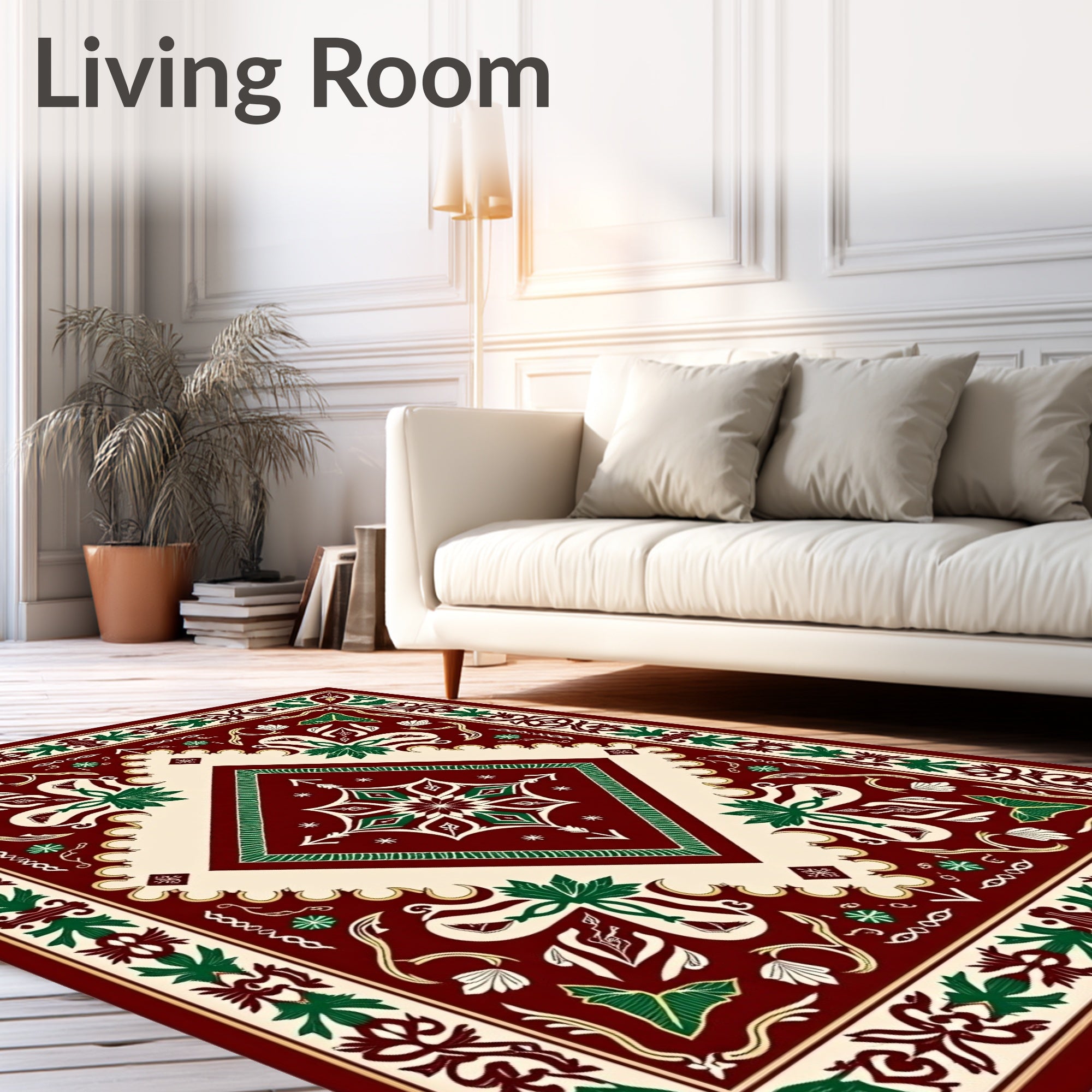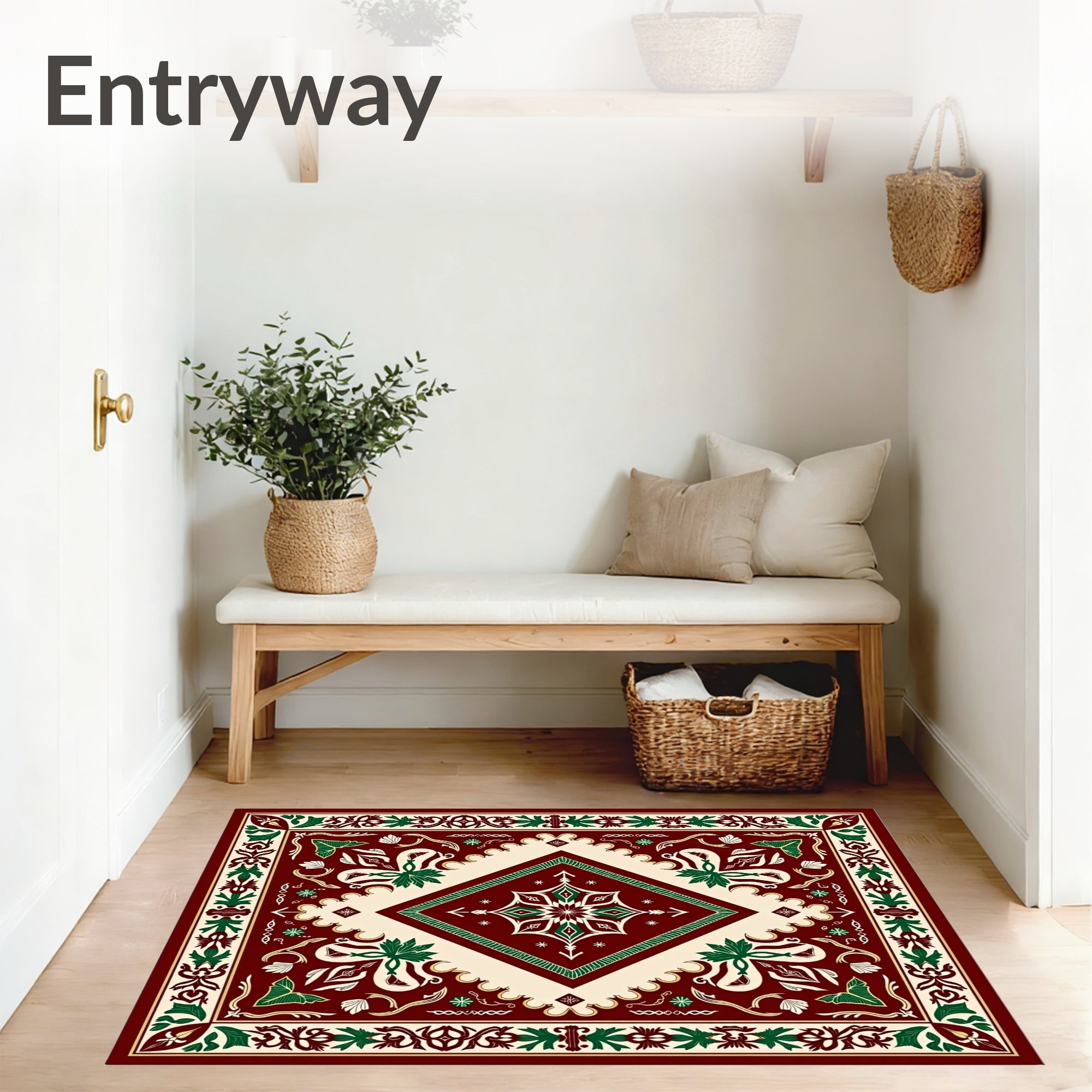 Ultra Soft Area Rug, Non Slip, Stain Resistant, Washable Area Rugs for Living Room, Bedroom, Vintage Holiday Trellis Area with Festive Motifs(Burgundy) Overview: