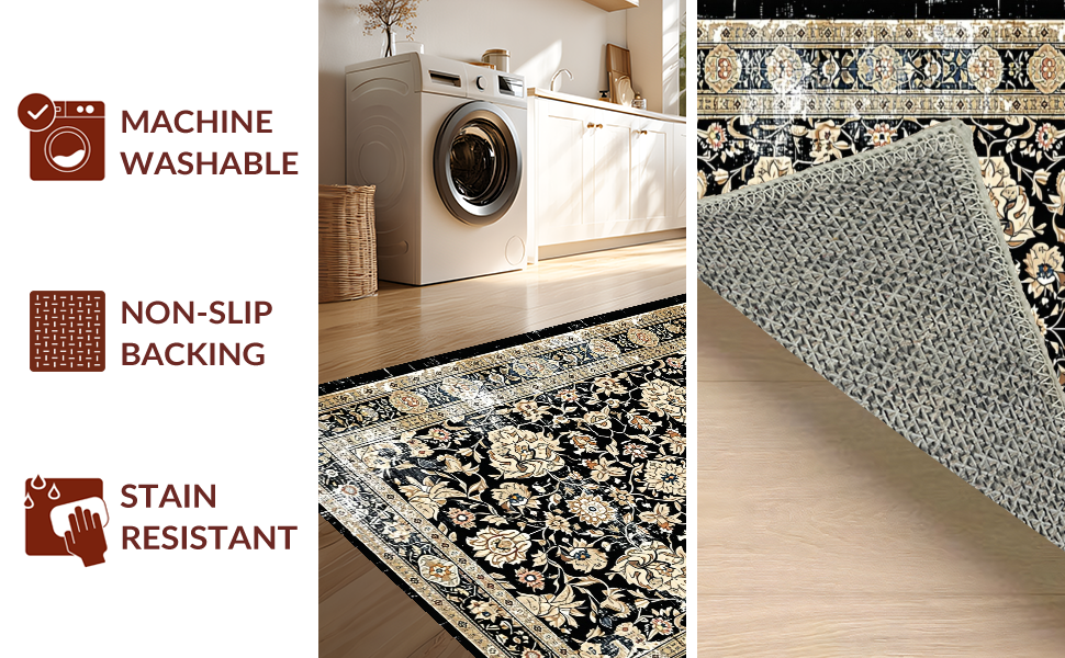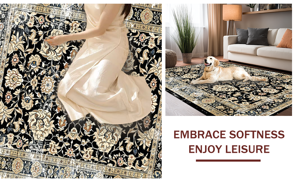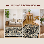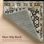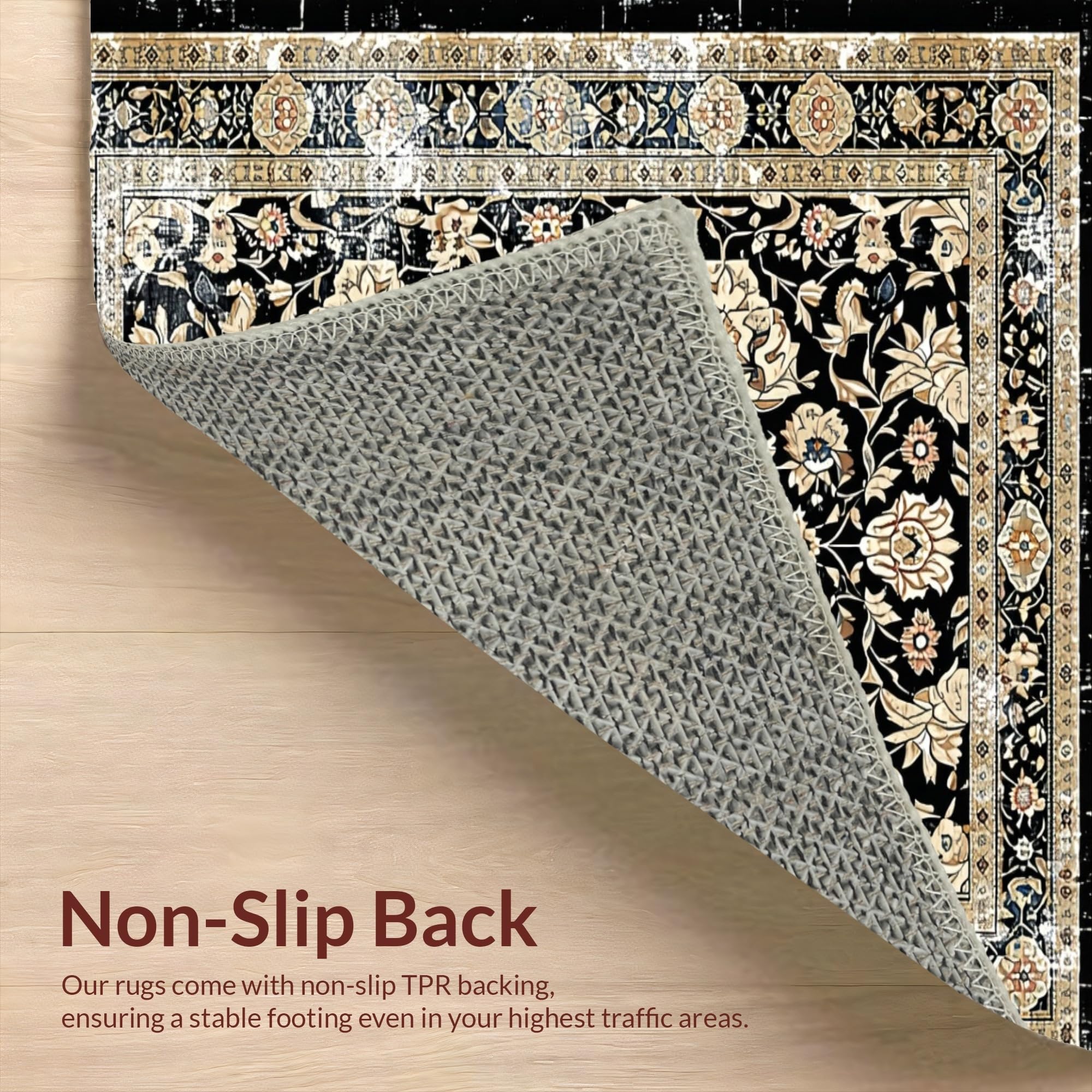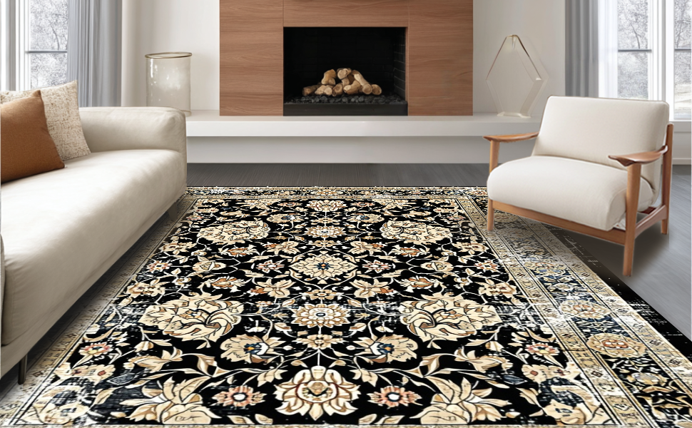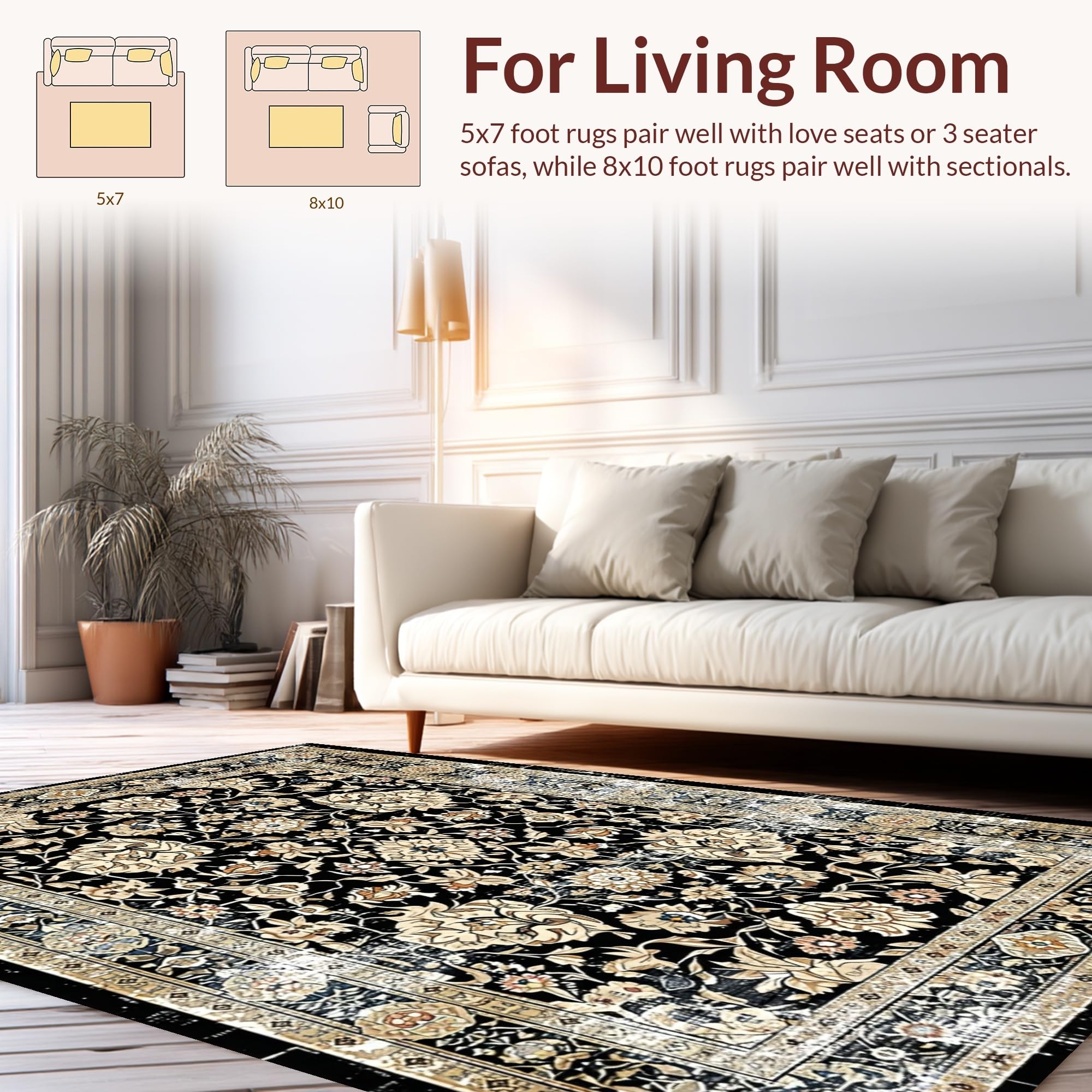 Ultra Soft Area Rug, Non Slip, Stain Resistant, Washable Area Rugs for Living Room, Bedroom, Vintage Inspired Botanical Design(Black) Overview: