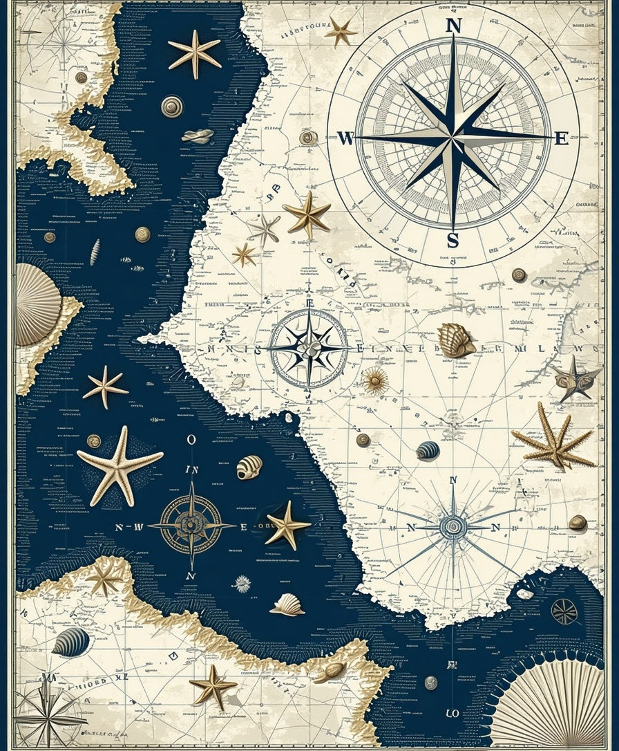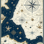 Vintage Nautical Map Inspired Featuring Starfish and Sea Shell Silhouettes(Blue)