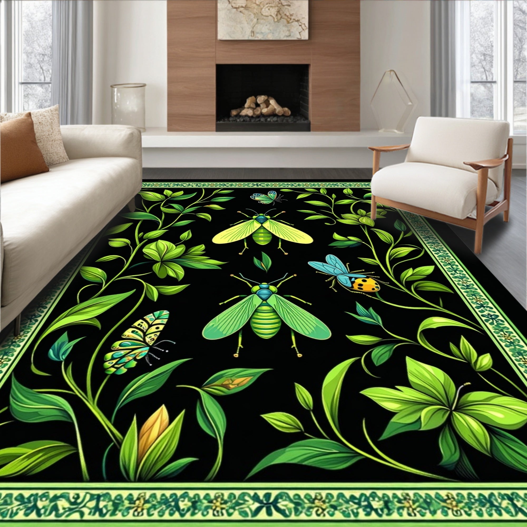 Flatwoven High Traffic Area Rug, Vivid Green Insect Aesthetic, Non Slip, Stain Resistant, Washable Area Rugs for Living Room, Bedroom (Black) Overview: