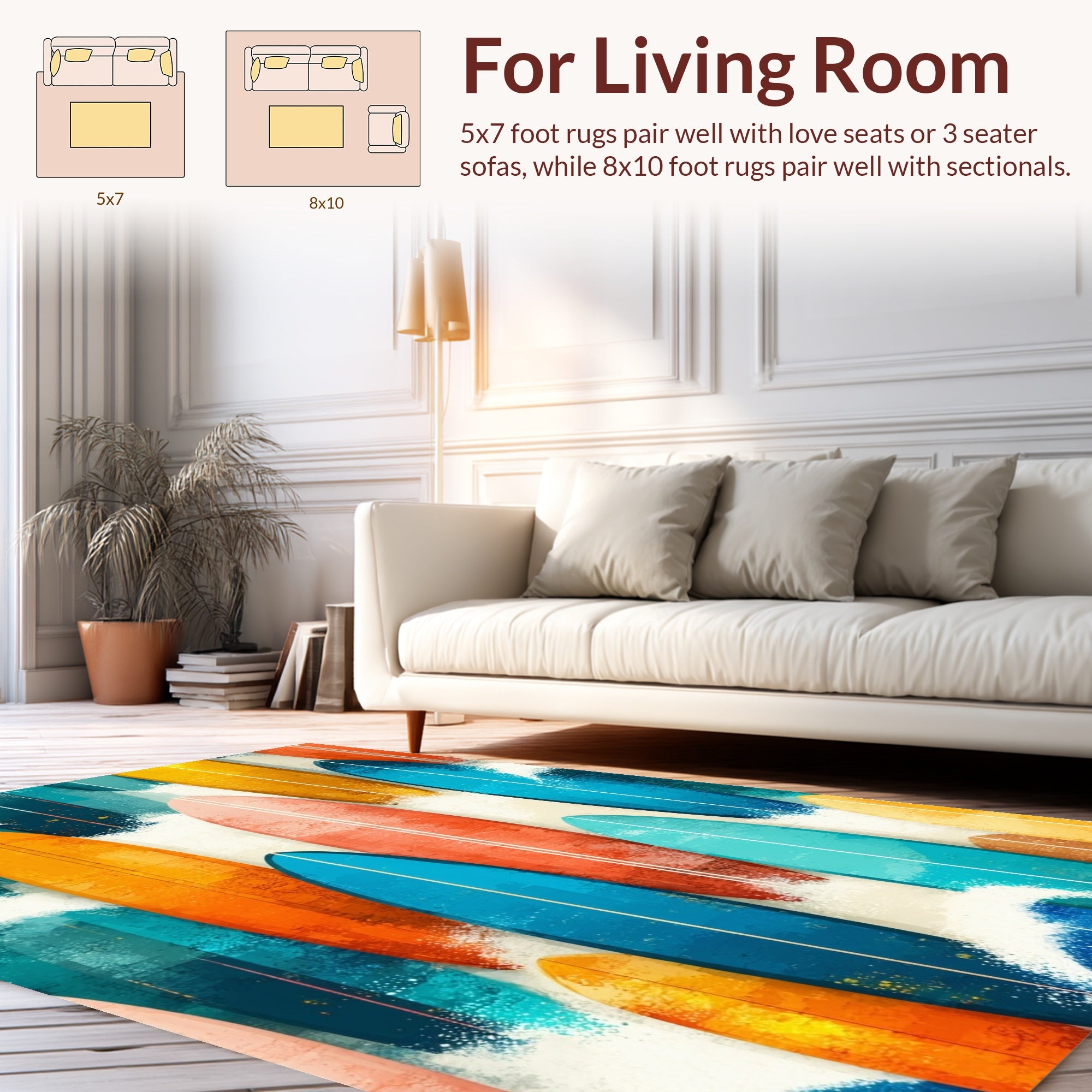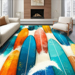 Flatwoven High Traffic Area Rug, Wave Rider Surf Plank Decorative with Ocean Motifs, Non Slip, Stain Resistant, Washable Area Rugs for Living Room, Bedroom (Blue) Overview: