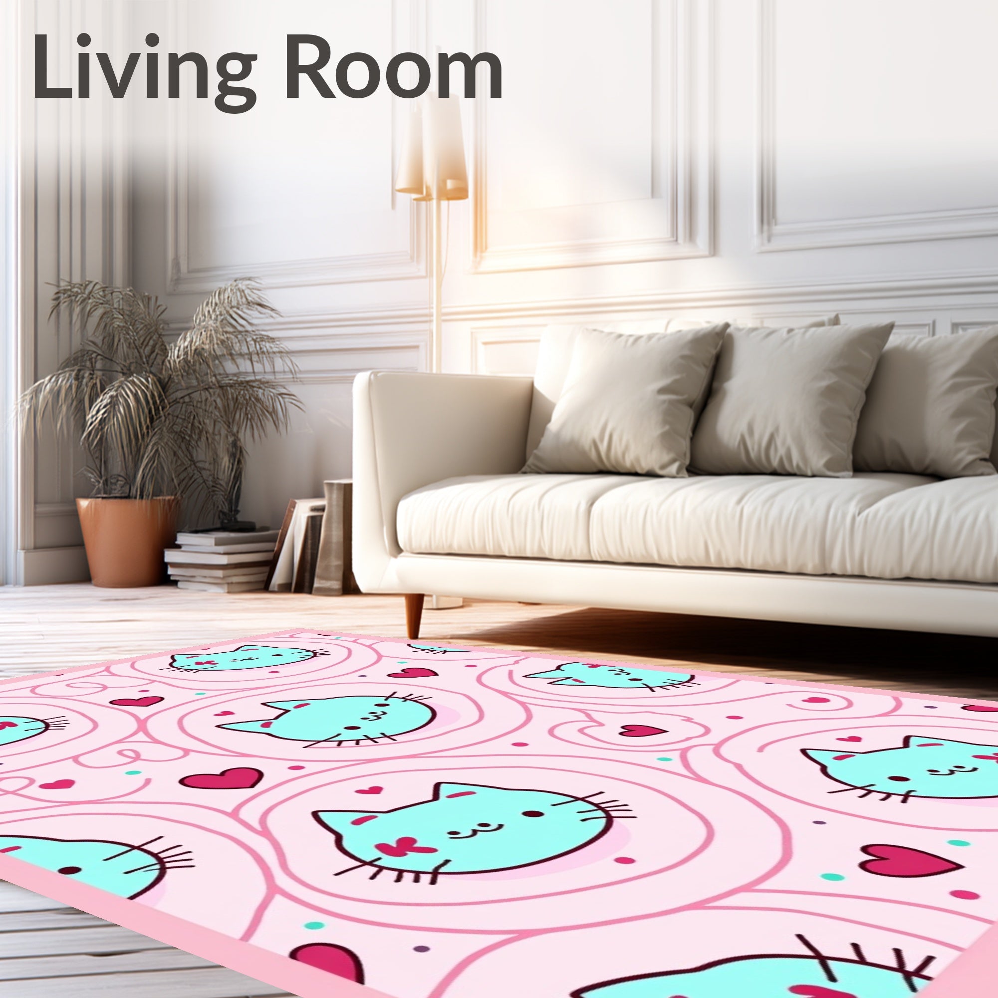 Flatwoven High Traffic Area Rug, Whimsical Cartoon Feline Parade with Playful Paws Motif, Non Slip, Stain Resistant, Washable Area Rugs for Living Room, Bedroom (Pink) Overview: