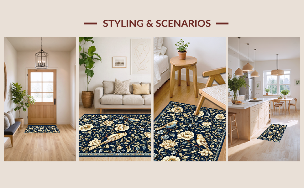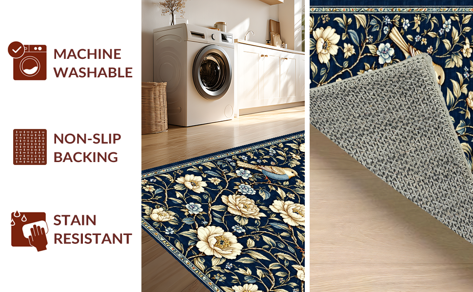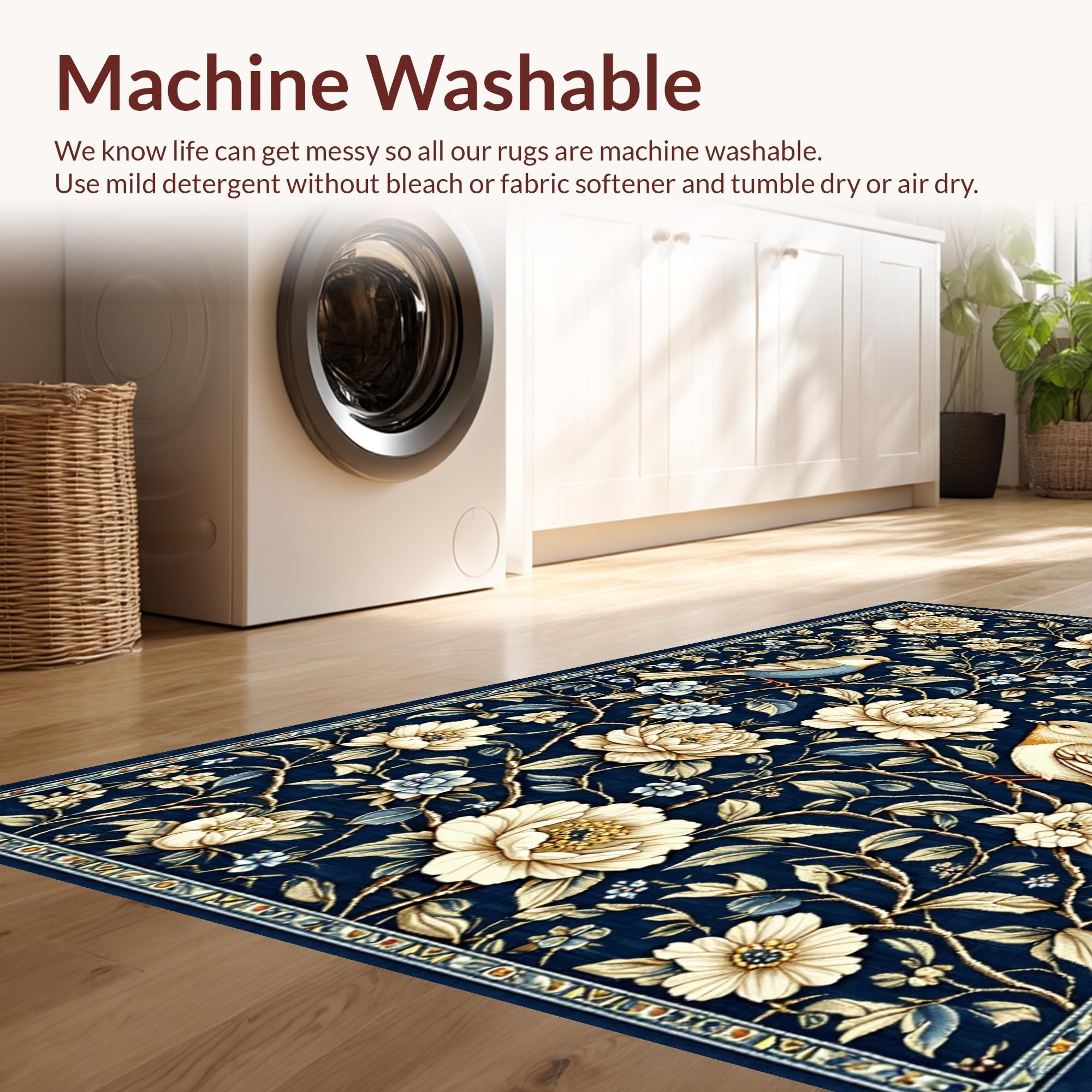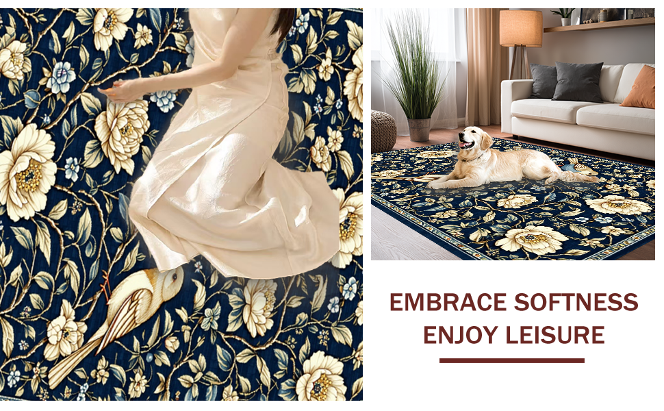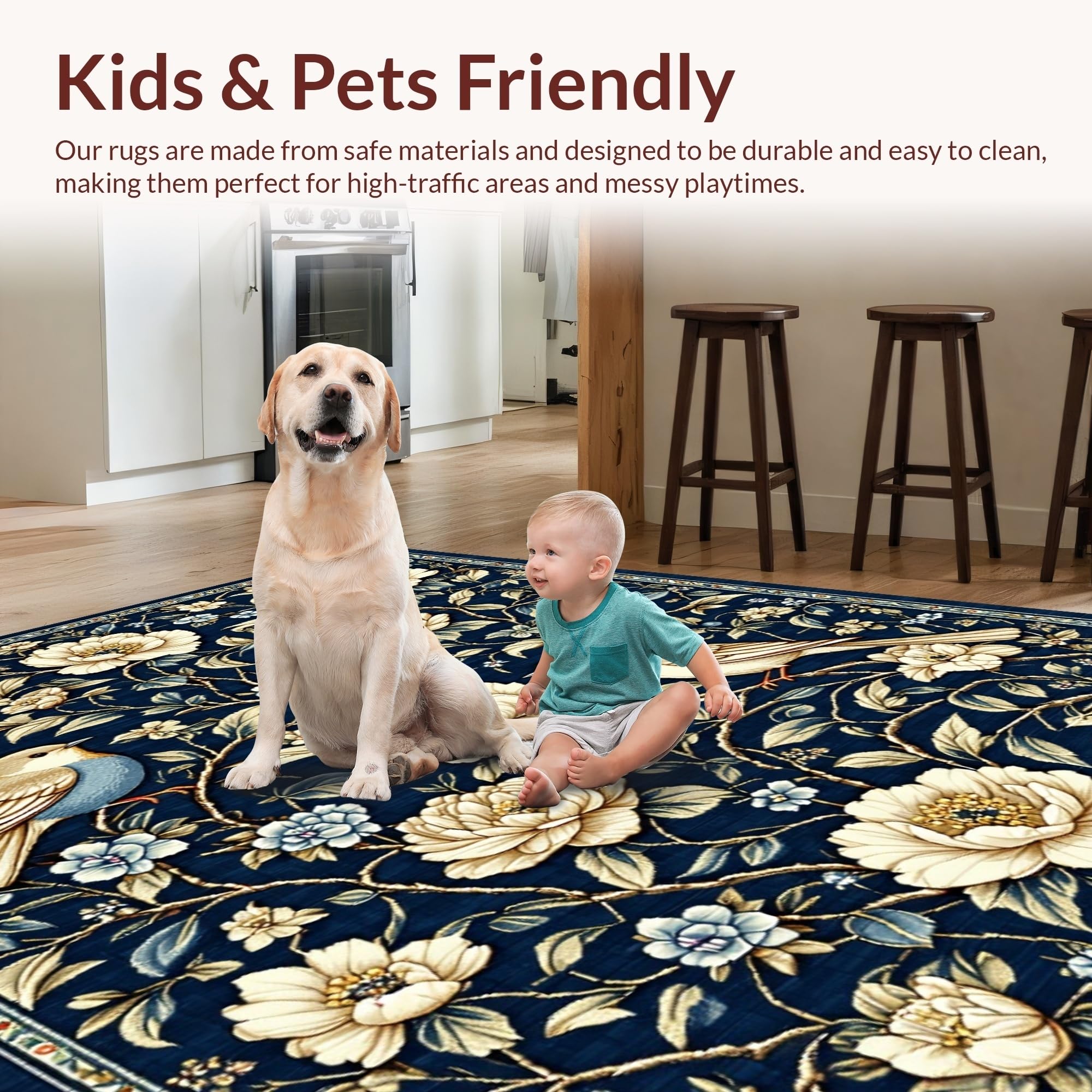 Ultra Soft Area Rug, Non Slip, Stain Resistant, Washable Area Rugs for Living Room, Bedroom, Whimsical Floral and Bird Fusion(Blue) Overview: