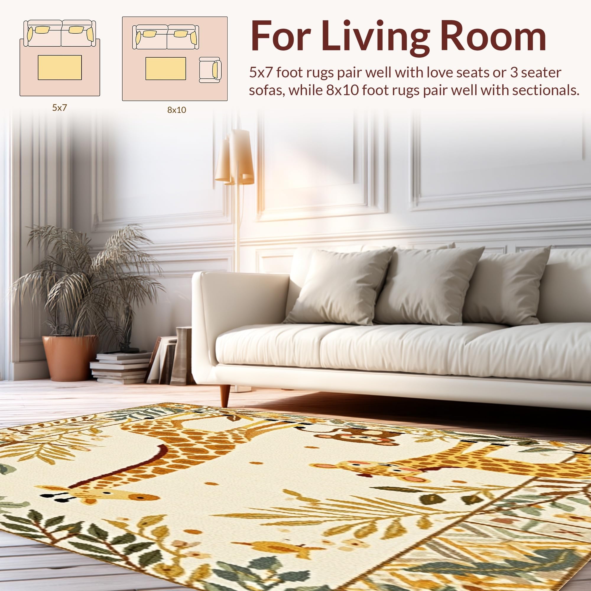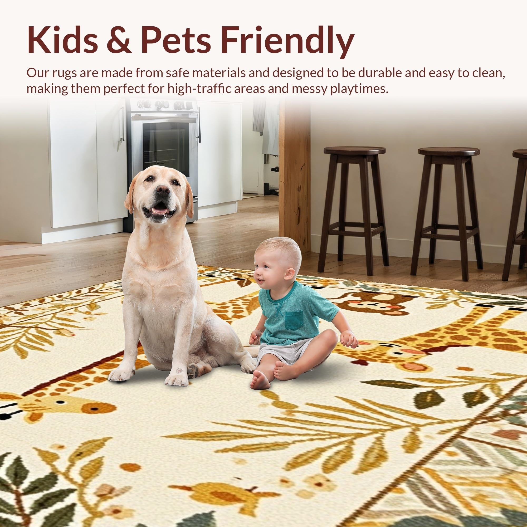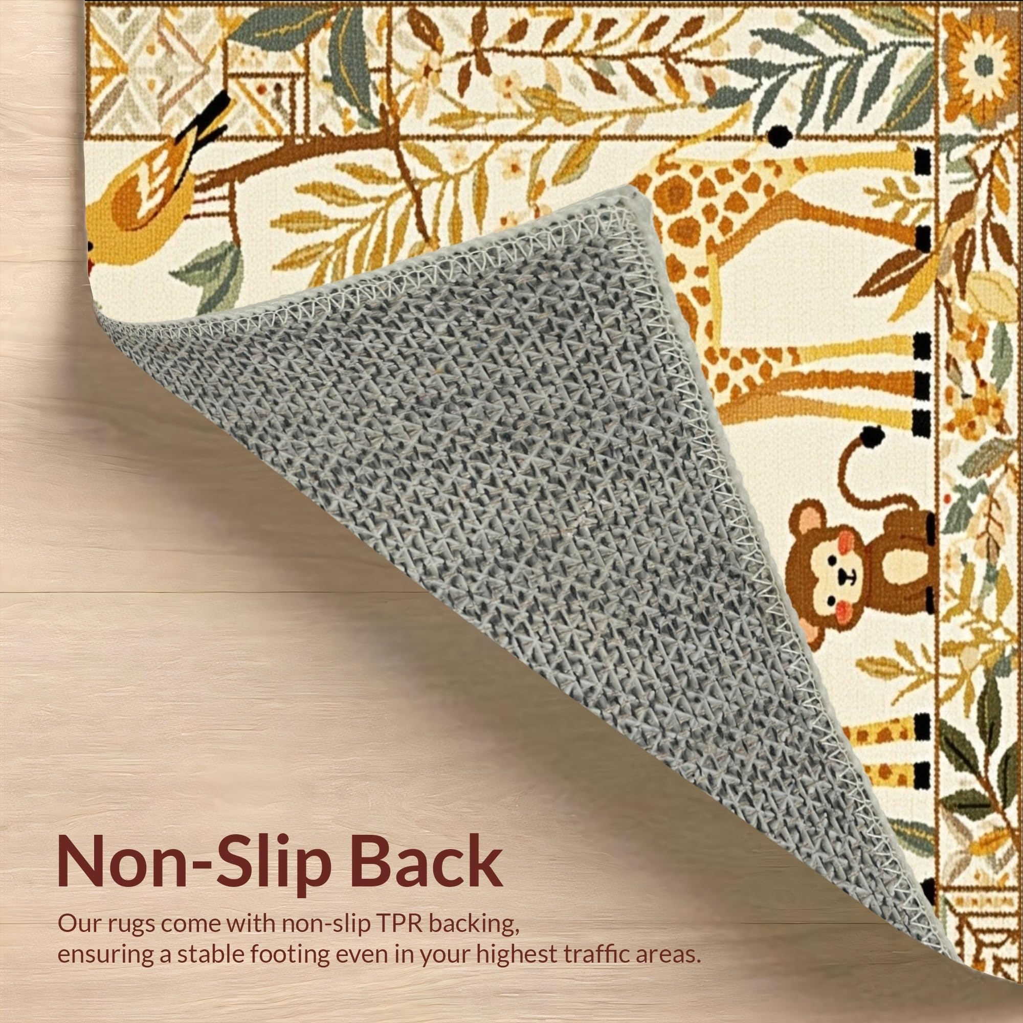 Ultra Soft Area Rug, Non Slip, Stain Resistant, Washable Area Rugs for Living Room, Bedroom, Whimsical Jungle Friends Kids Area Beige Tones with Charming Animal Motifs(Beige) Overview: