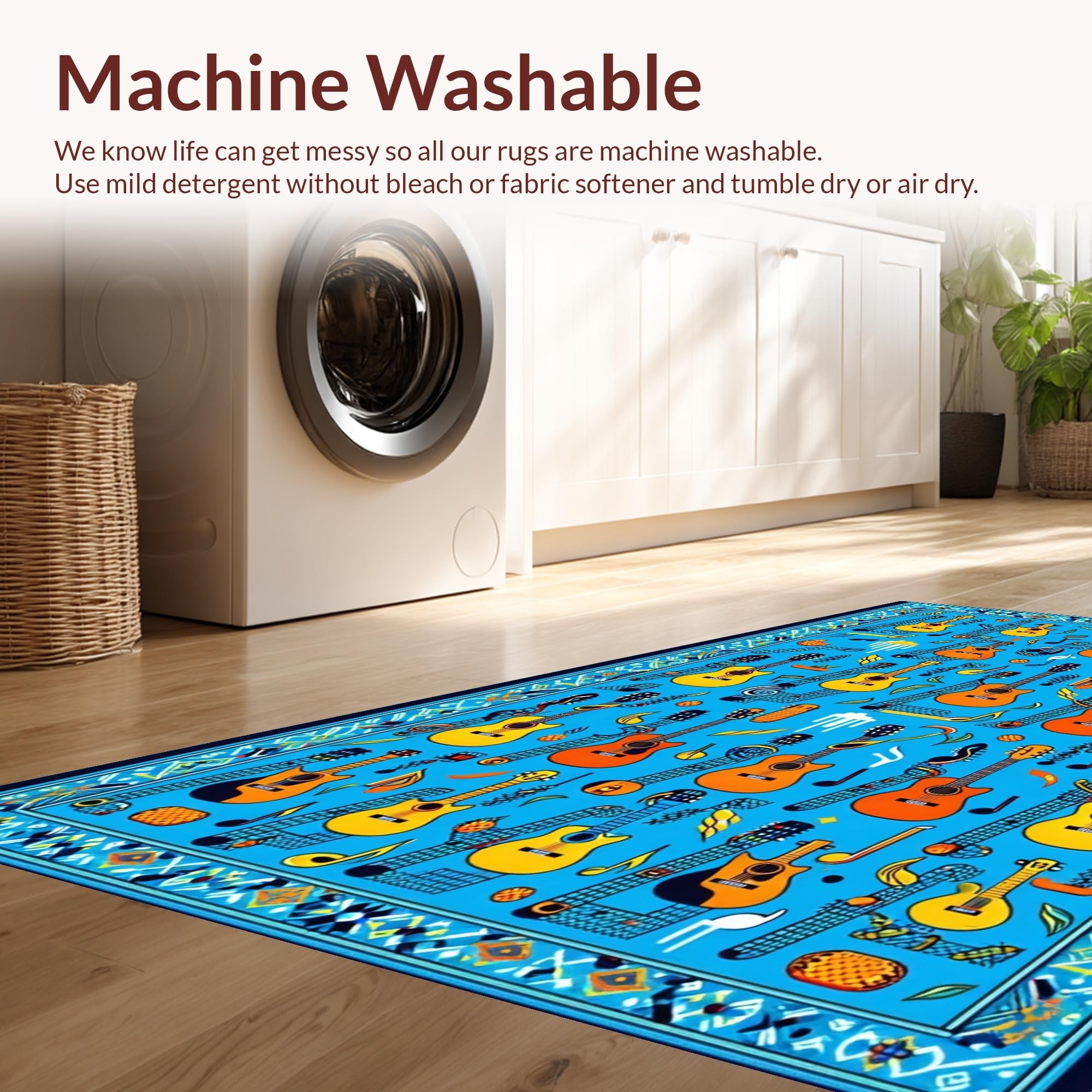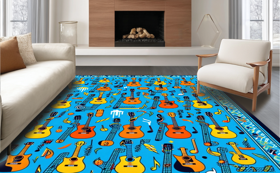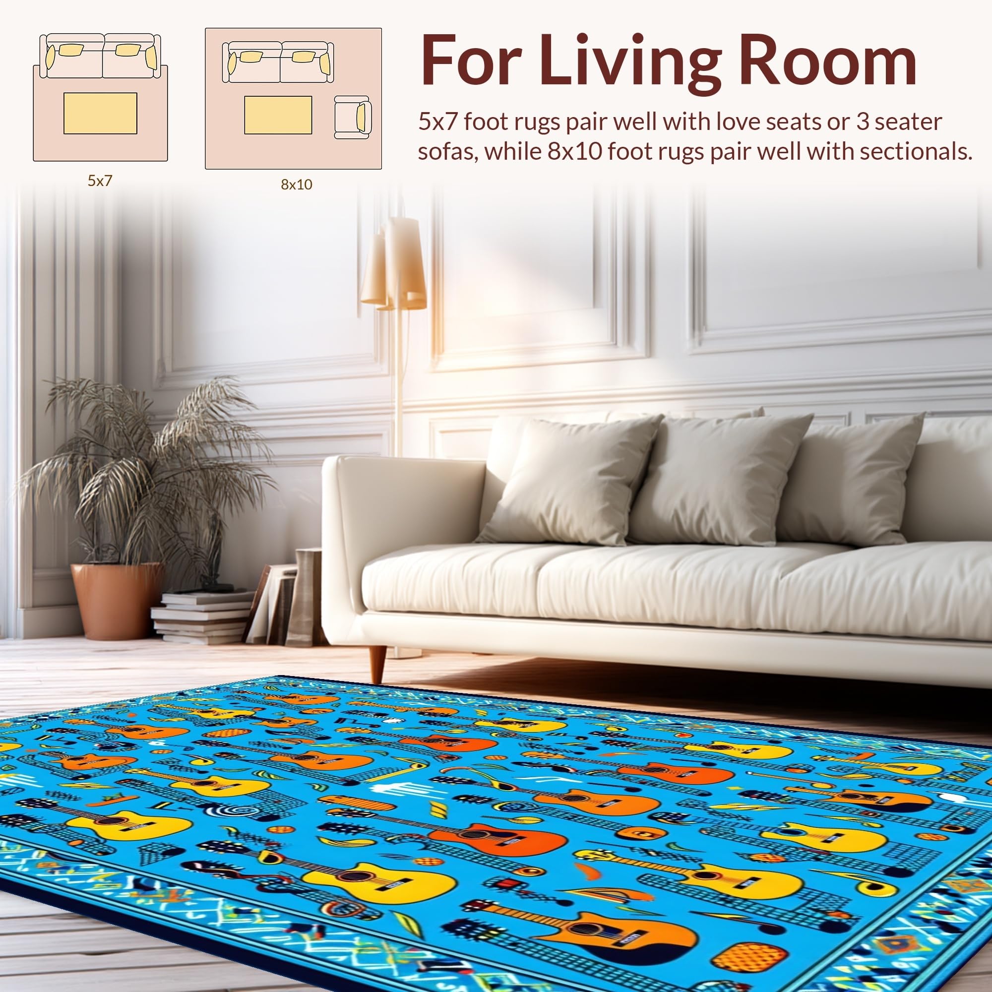 Ultra Soft Area Rug, Non Slip, Stain Resistant, Washable Area Rugs for Living Room, Bedroom, Whimsical Musical Montage Aesthetic(Blue) Overview: