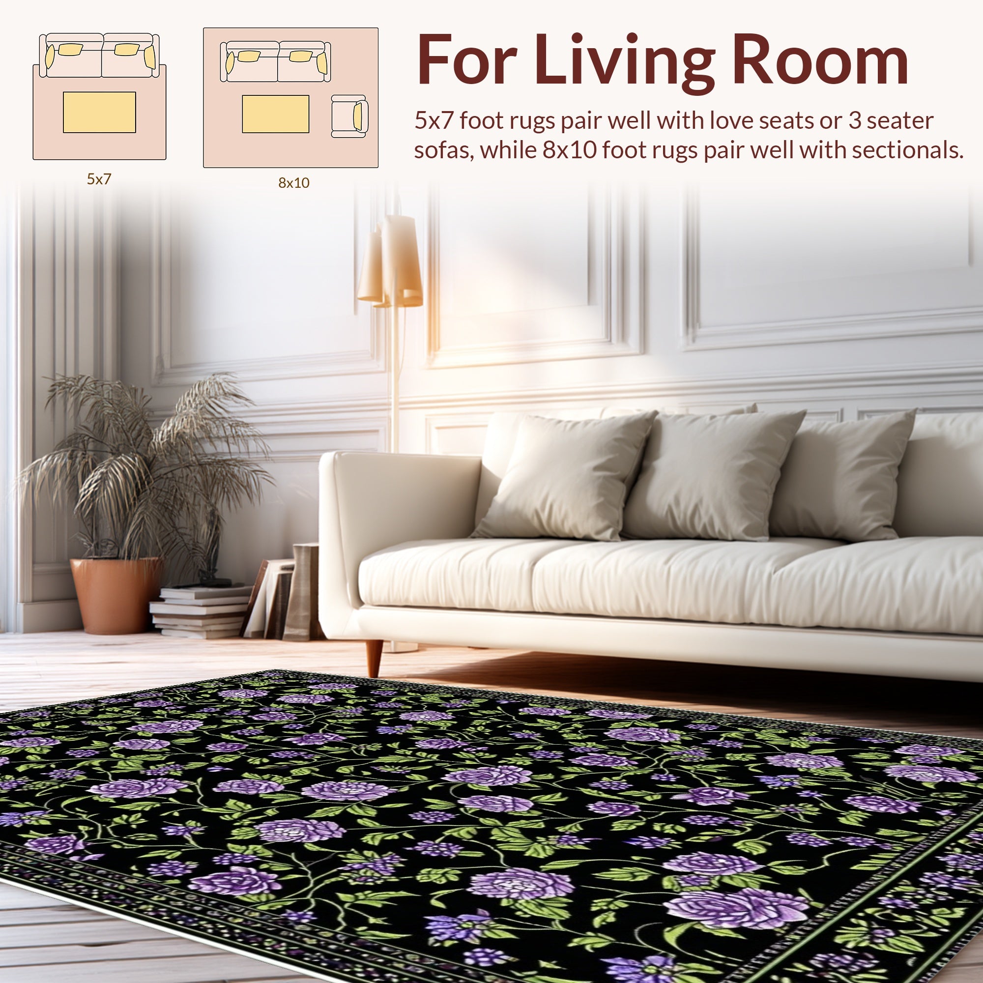 Flatwoven High Traffic Area Rug, Whimsical Nature Inspired Artistry, Non Slip, Stain Resistant, Washable Area Rugs for Living Room, Bedroom (Black) Overview: