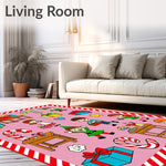 Ultra Soft Area Rug, Non Slip, Stain Resistant, Washable Area Rugs for Living Room, Bedroom, Whimsical Workshop Toy Factory with Cane Stripe Borders(Pink) Overview: