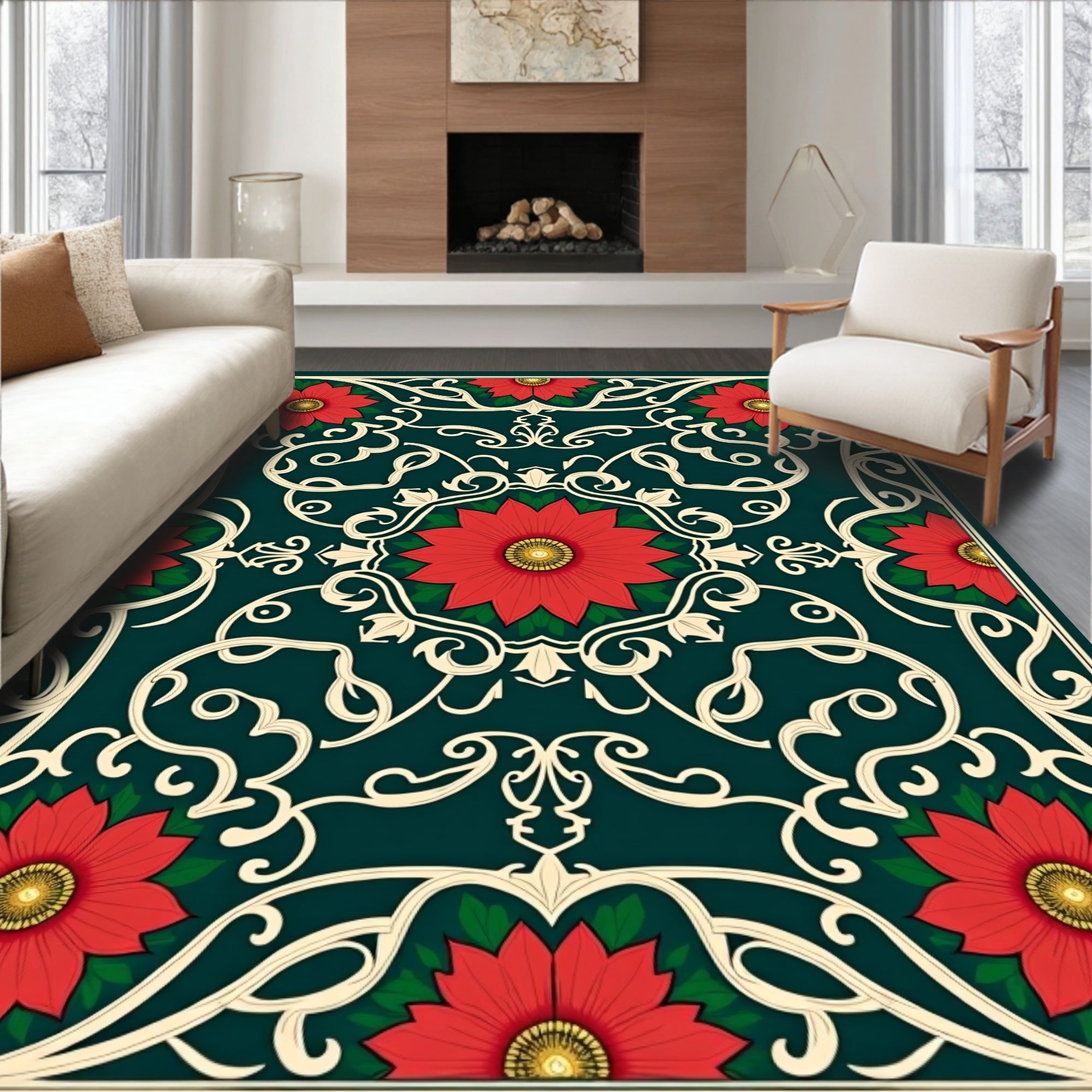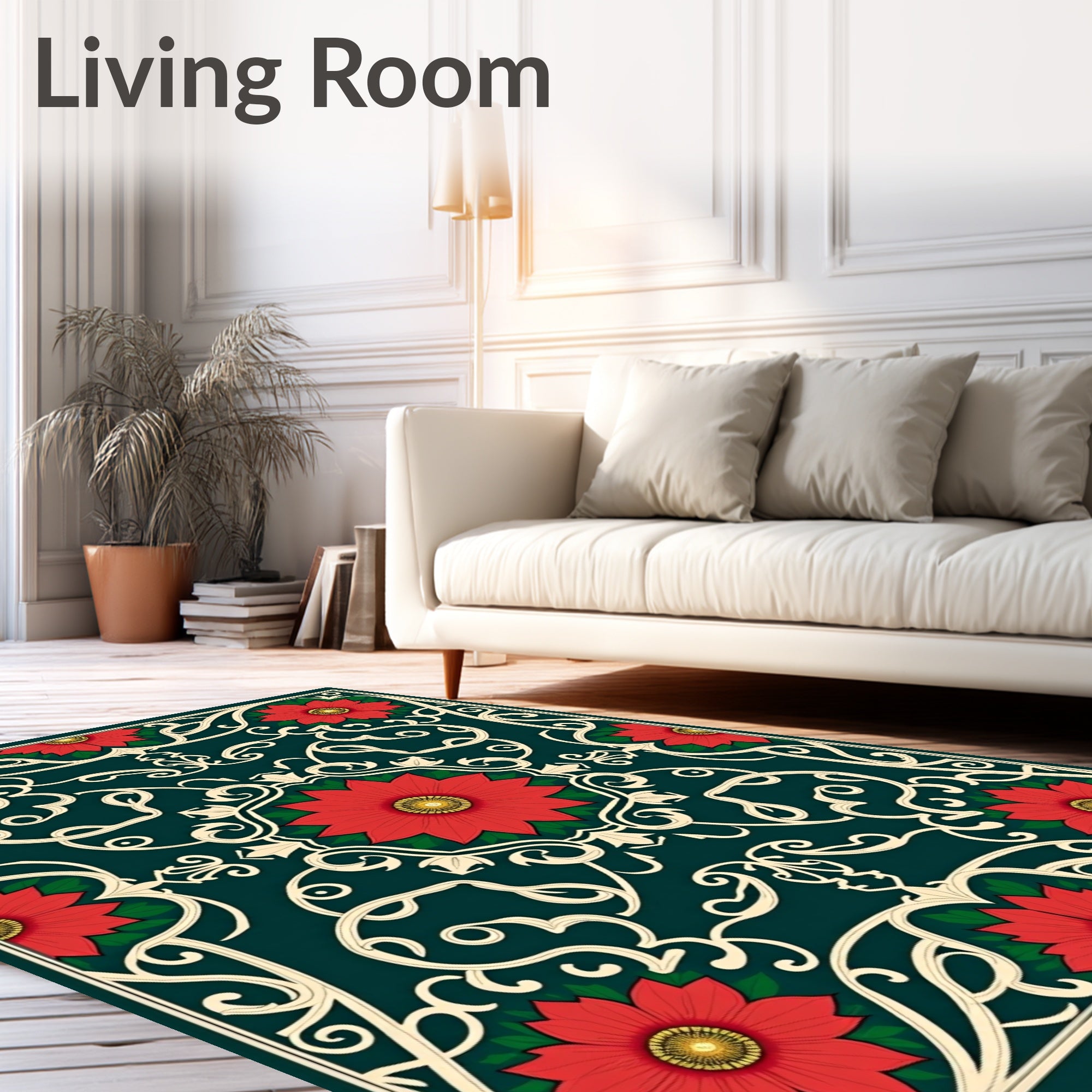 Ultra Soft Area Rug, Non Slip, Stain Resistant, Washable Area Rugs for Living Room, Bedroom, Whimsical Yuletide Scrollwork Poinsettia Filigree Artistic(Red) Overview: