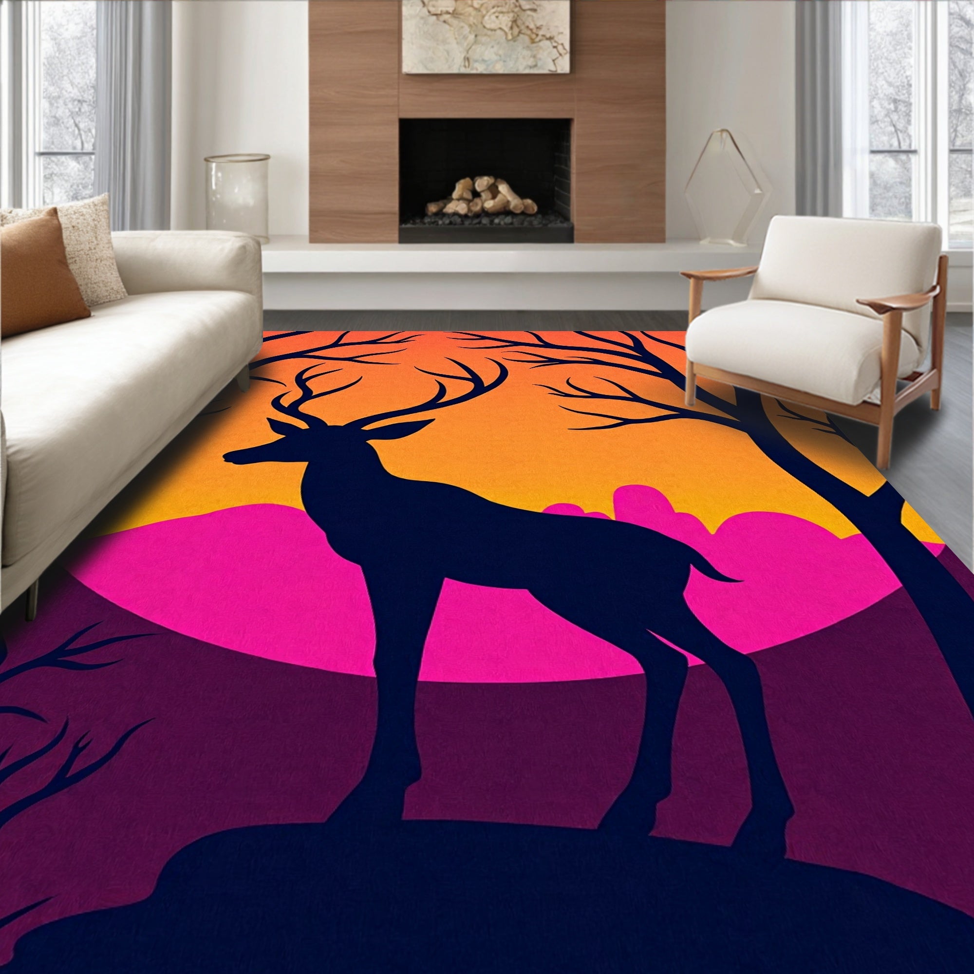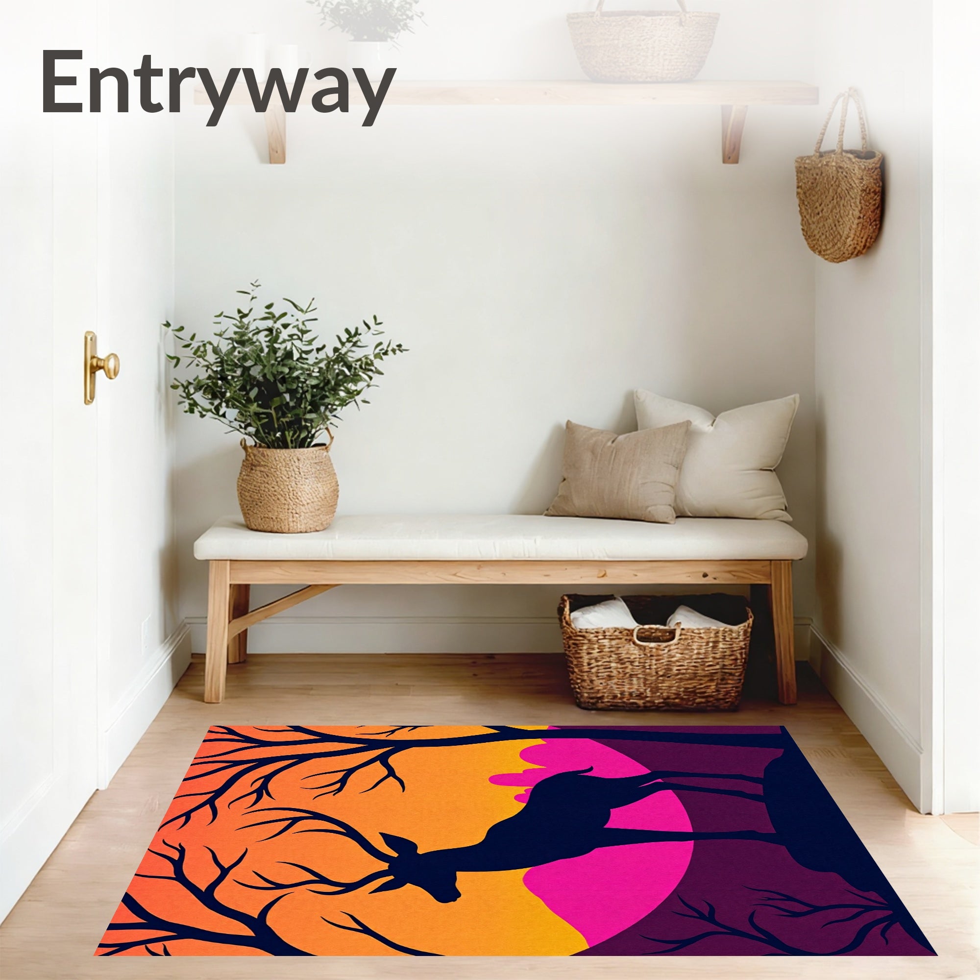 Ultra Soft Area Rug, Non Slip, Stain Resistant, Washable Area Rugs for Living Room, Bedroom, Wildlife Forest Edge Dusk Semicircular Welcome(Orange) Overview: