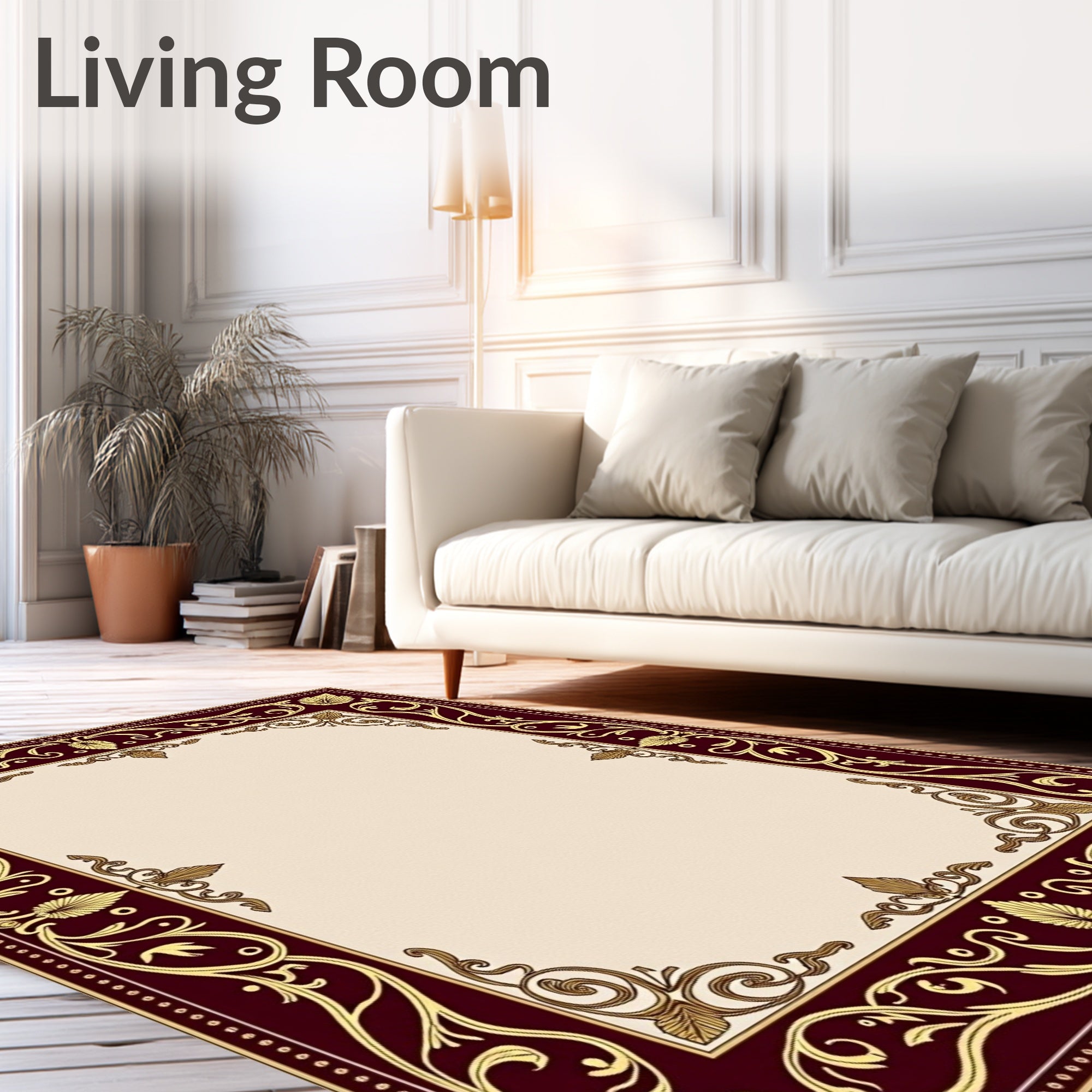 Flatwoven High Traffic Area Rug, Wine Glass Motif with Interlocking Vine Scrollwork and Baroque Details, Non Slip, Stain Resistant, Washable Area Rugs for Living Room, Bedroom (Gold) Overview: