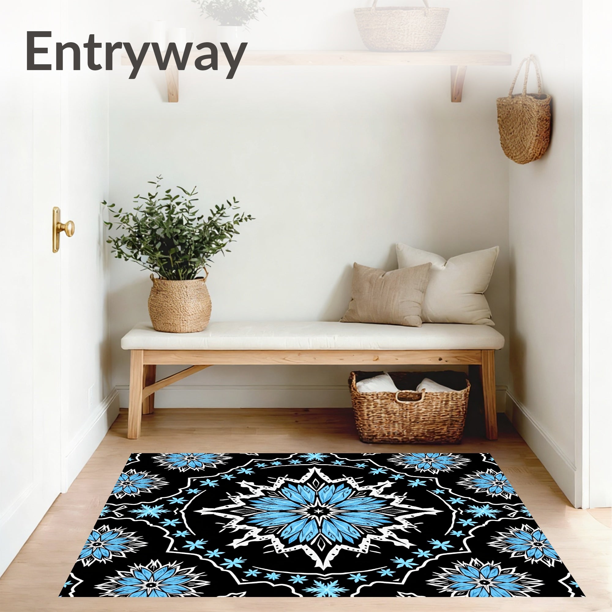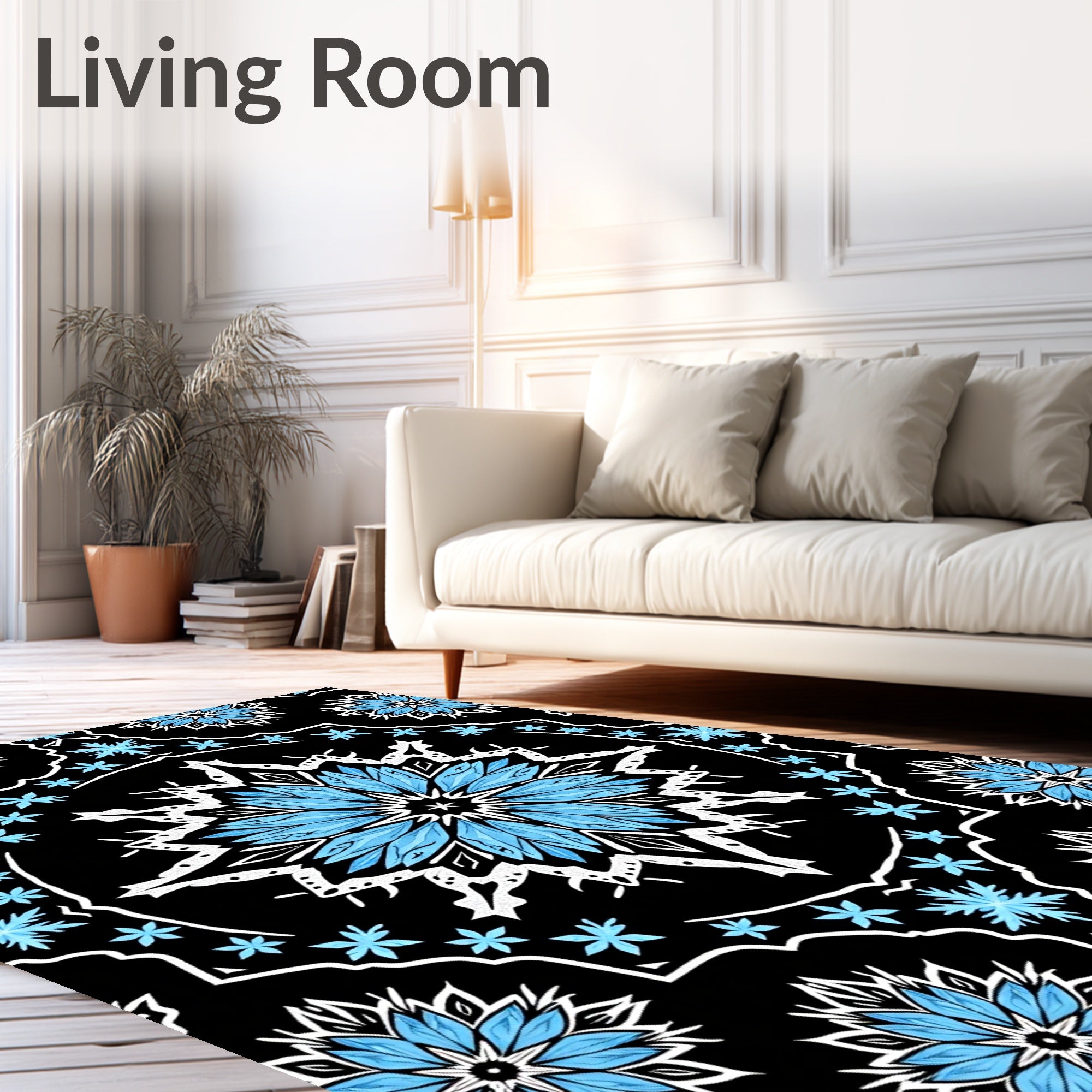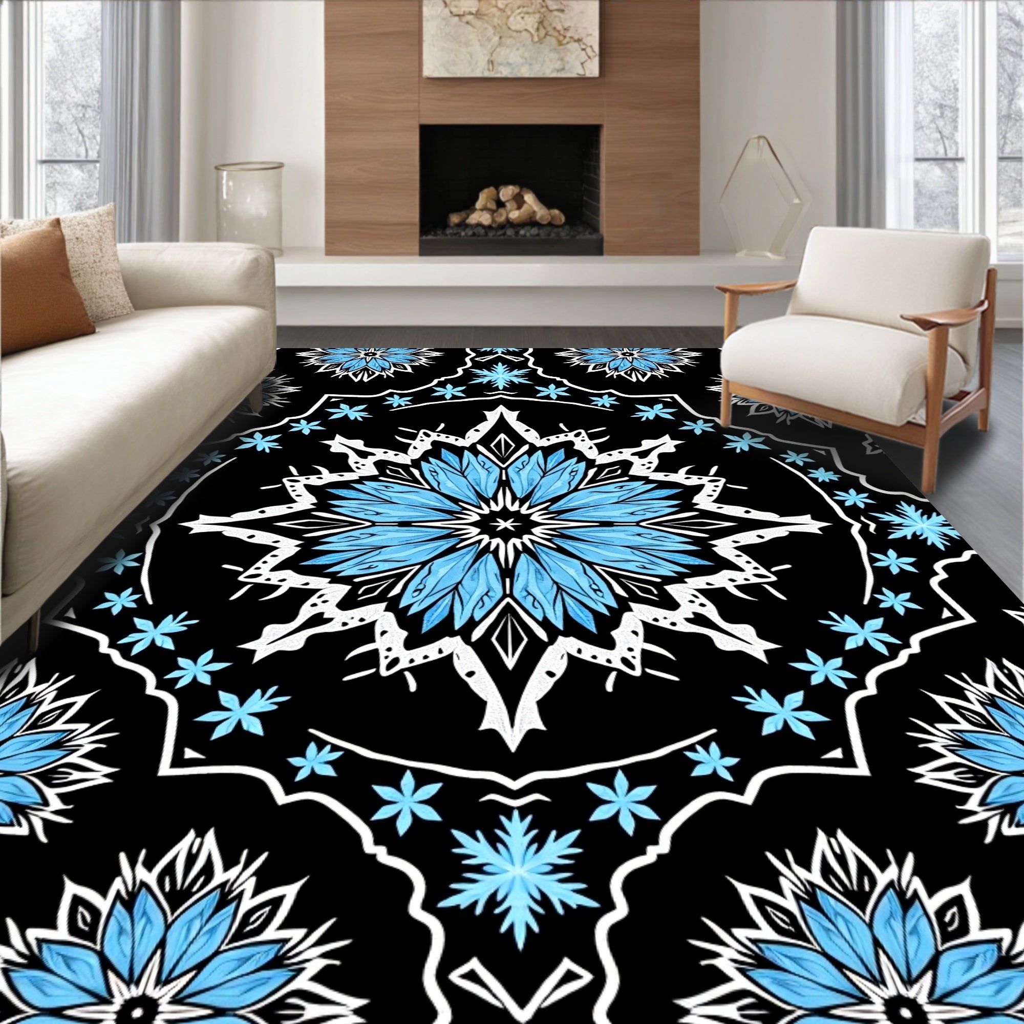 Ultra Soft Area Rug, Non Slip, Stain Resistant, Washable Area Rugs for Living Room, Bedroom, Winter Snowflake Medallion Design with Crystalline Details(Black) Overview: