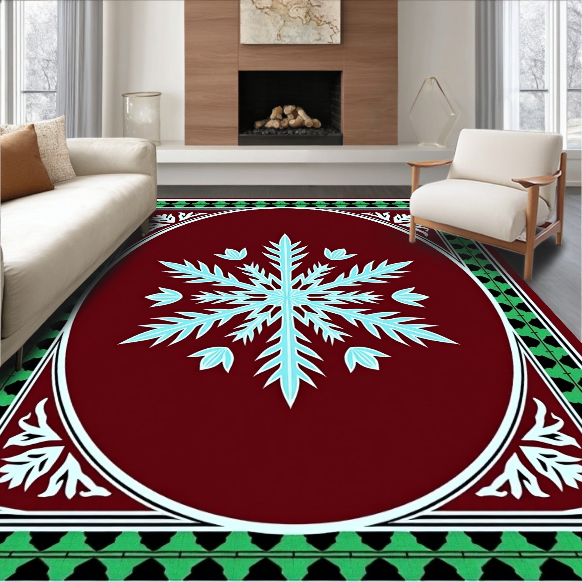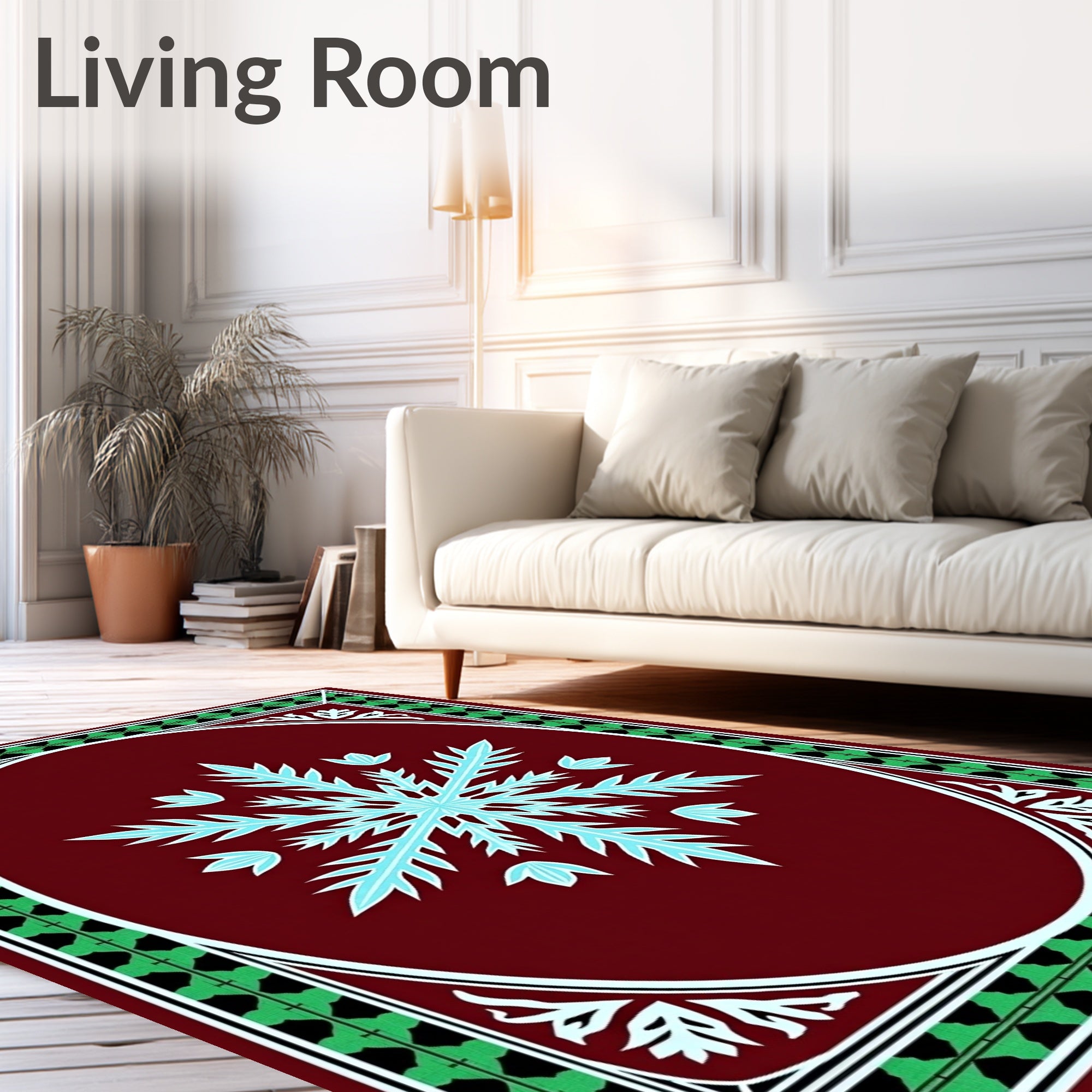 Ultra Soft Area Rug, Non Slip, Stain Resistant, Washable Area Rugs for Living Room, Bedroom, Winter Wonderland Frosty Medallion With Tartan Edge(Red) Overview: