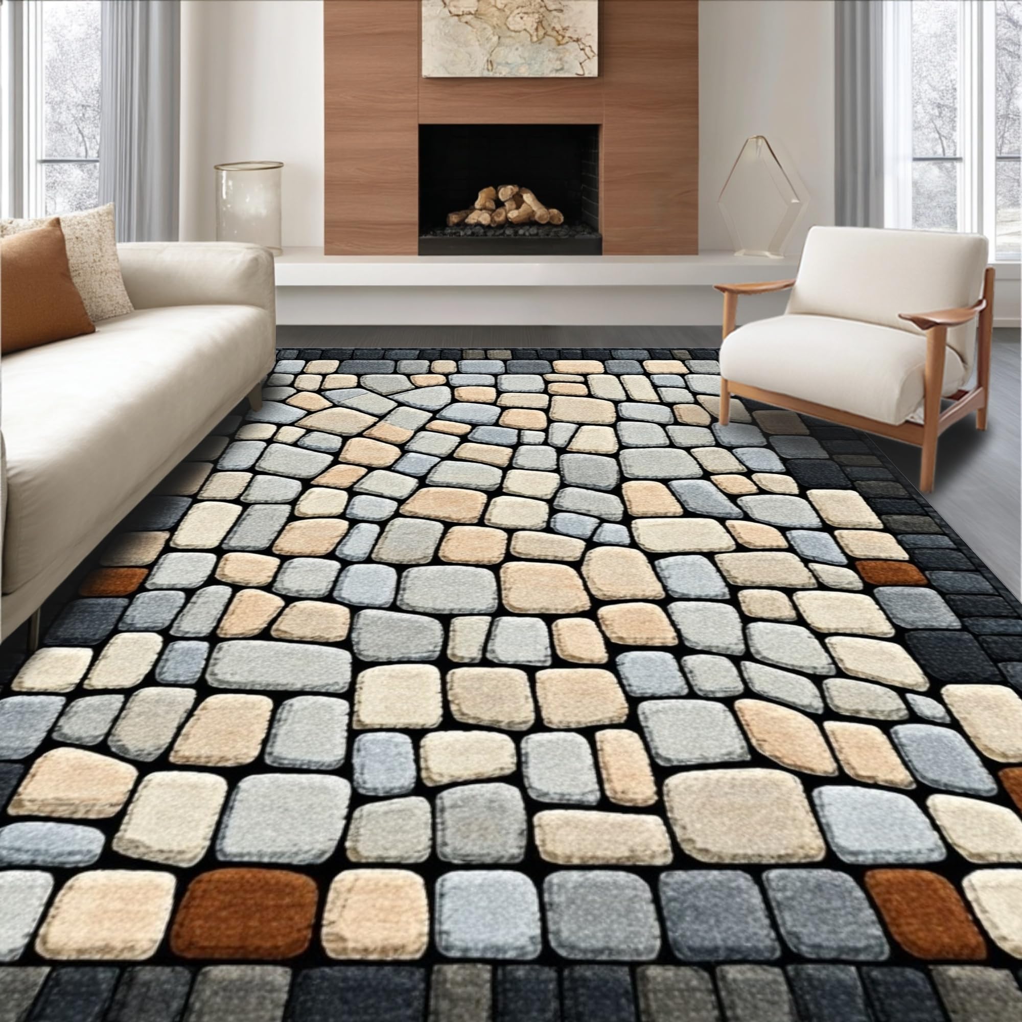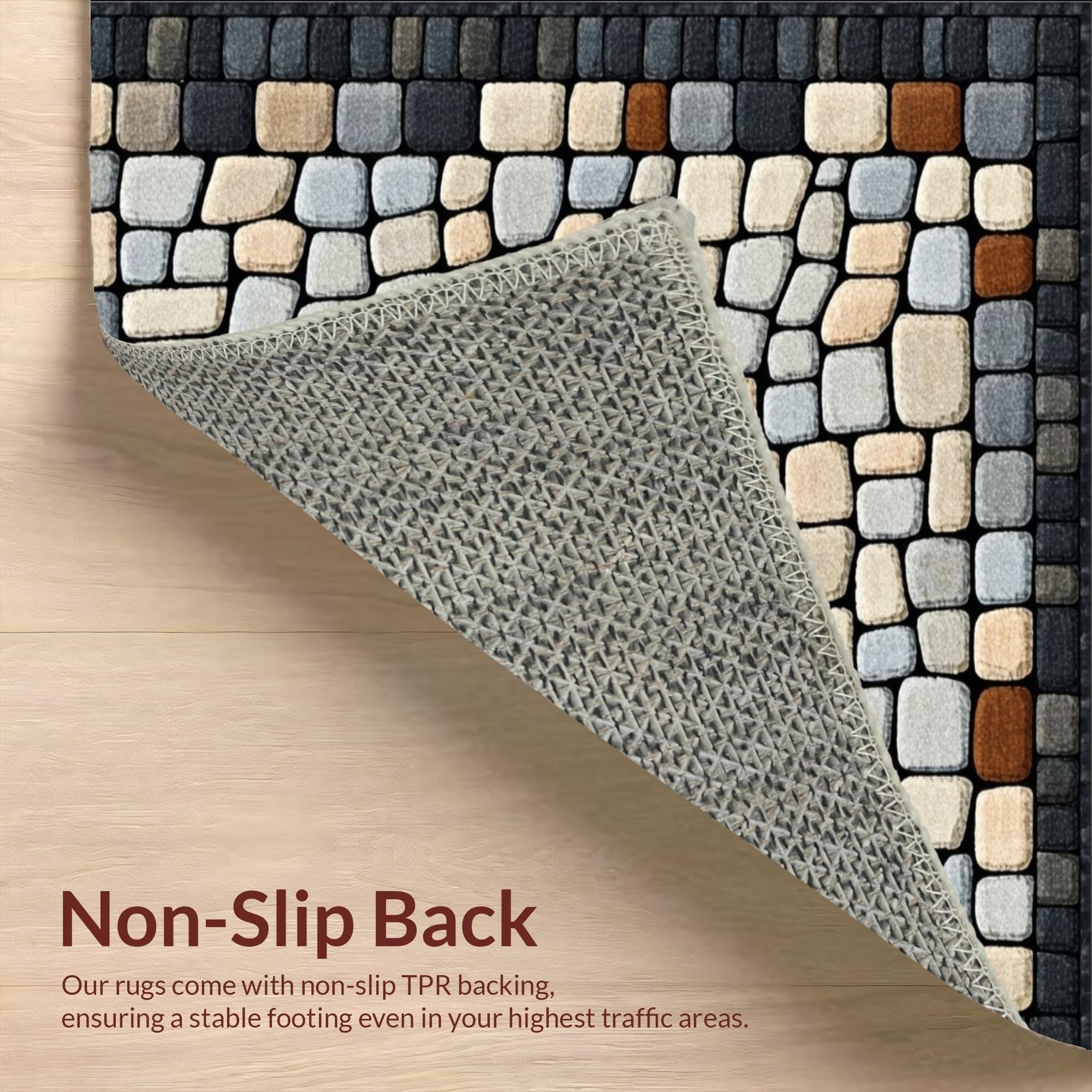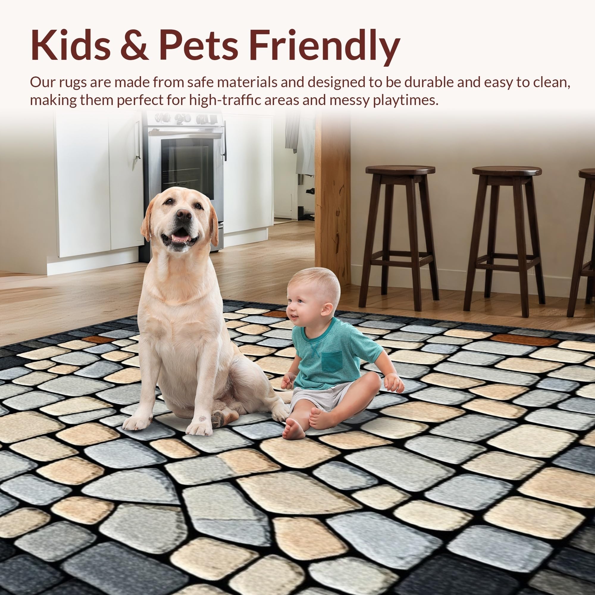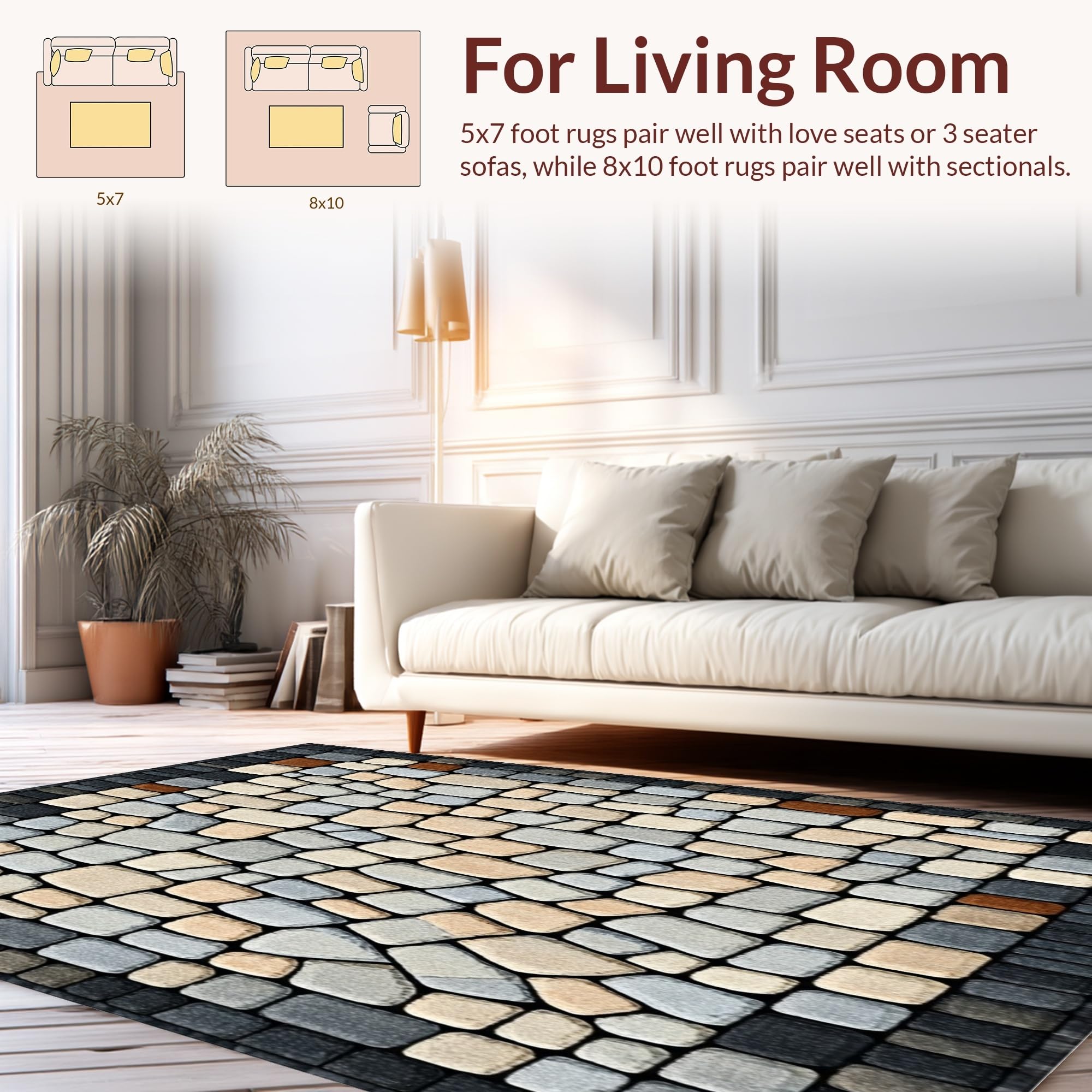 Ultra Soft Area Rug, Non Slip, Stain Resistant, Washable Area Rugs for Living Room, Bedroom, Zen Stone Mosaic Area with Cobblestone Inspired Boho Geometric Motifs(Beige) Overview: