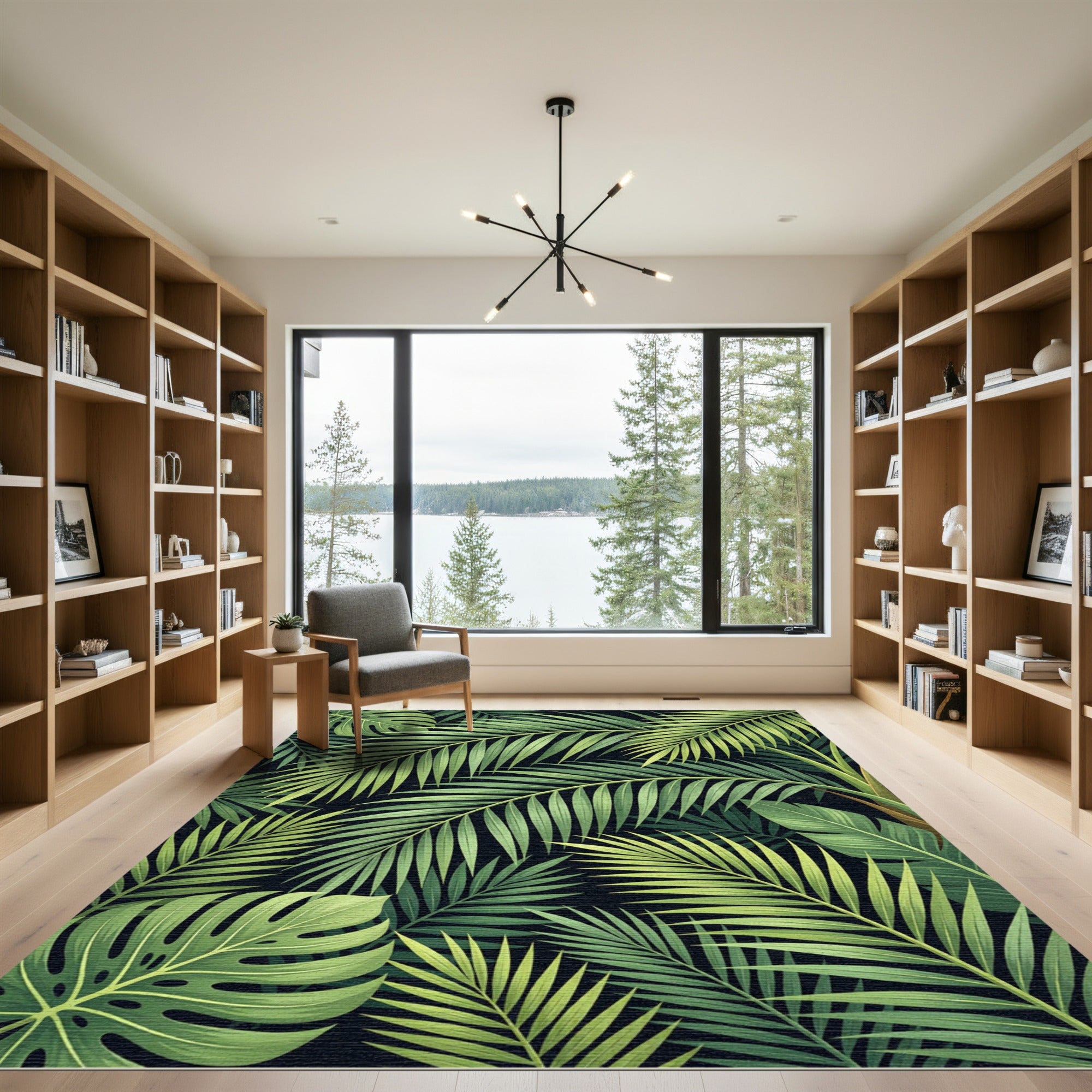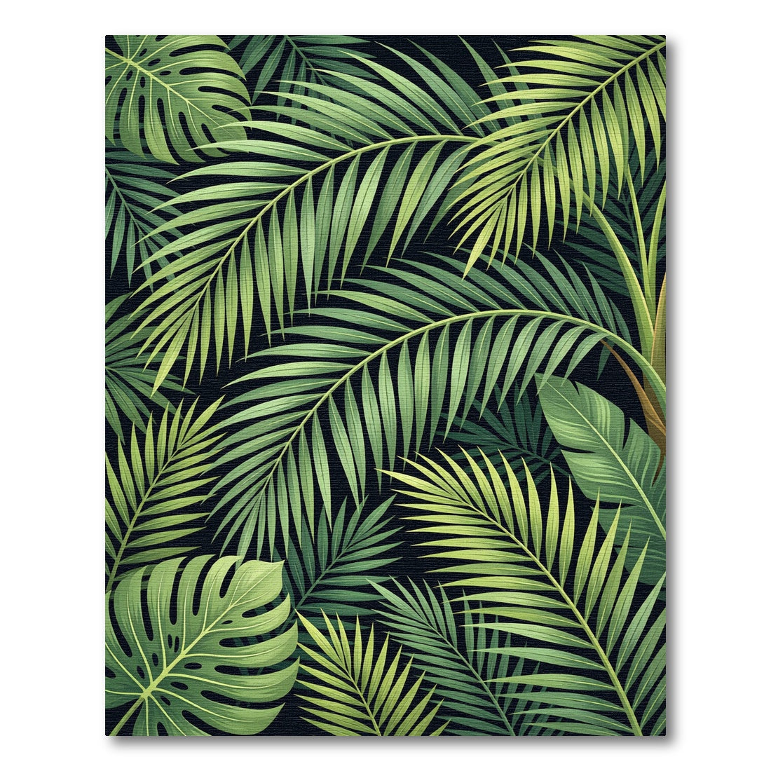 Channel the vibrant spirit of Neo-Tropical Modernism with this Verdant Leafy Tropical Abundance Rug. This design is a visual echo of midcentury explorations into the exotic, capturing the lush, untamed beauty of a faraway rainforest canopy. Cascading palm fronds and iconic monstera leaves intertwine in a rich tapestry, their emerald hues offering a striking contrast against a dramatic, void-black backdrop. This isn't just a pattern; it's an invitation to immerse yourself in nature's embrace. Imagine stepping onto this rug, and instantly the room transcends its walls—air feels fresher, light softens, and you're transported to a serene, secluded sanctuary. For the soul that craves an escape, for the home that thrives on bold, organic statements, this rug is a declaration of life, lushness, and vibrant tranquility. Let this design anchor your space, transforming the everyday into an immersive, natural escape. Live in the heart of the jungle, no matter where you are.